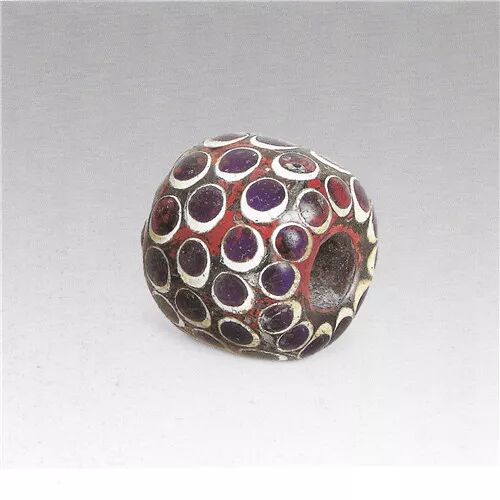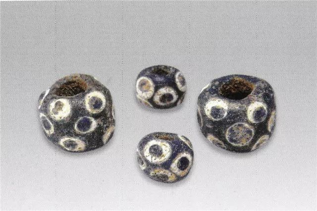蓝色玻璃体饰蓝点纹珠,圆形,中有一孔。有玻璃光,半透明。蓝点有白边,是嵌入器表的装饰,嵌入厚嘉文,使与器胎结为一体。这种珠战国时十分流行。长2、径2.2厘米。化学分析为中国产的铅钡玻璃。中山王厝墓出土。