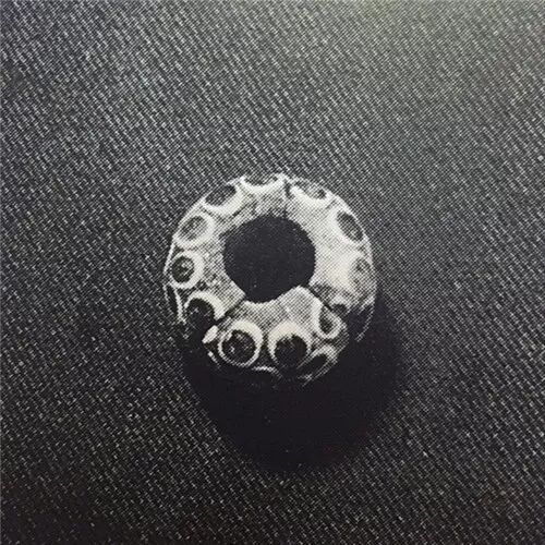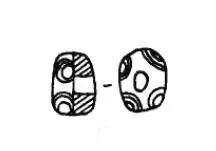 长圆形,中间一穿孔,上下两边端有多道圆圈纹,珠色呈蓝色玻璃体。左长径1.2、短径1、厚0.9厘米。右圆形,径1厘米。中山王族三号墓出土。