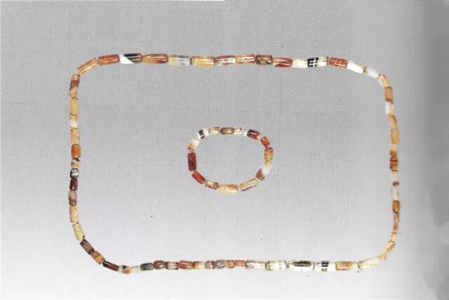 管状珠。珠身色彩多样,呈条纹状,有红、、青、淡黄、黑和灰色等,表面光泽较好。一些经高温烘烤的已无光泽,而且变成灰白色。完整而光泽较好的串珠,最大者长2厘米,最小的0.8厘米,大多数为1厘米。中山王族三号墓出土。