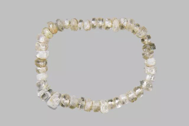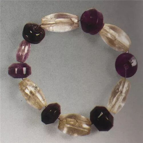 由扁圆形紫冰石串珠六颗、腰鼓形水晶串珠五颗和一颗腰鼓形紫冰石串珠各间隔一颗组成。中山古城外一般墓葬出土。