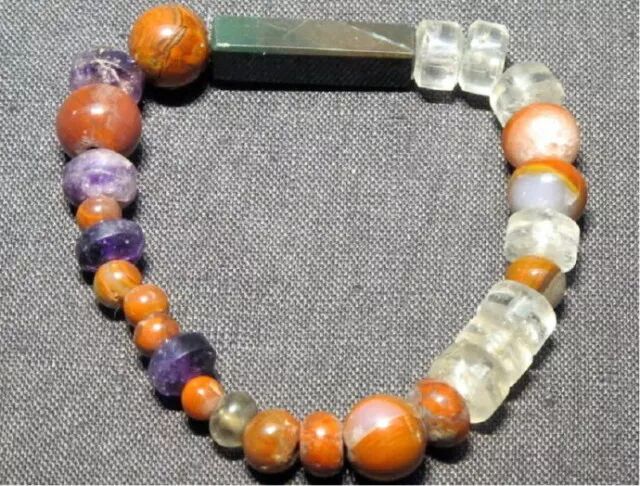 由长条形墨绿色玉一件和球形红玛瑙串珠14颗、扁圆形水晶串珠八颗、扁圆形紫冰石串珠四颗组成。中山古城外一般墓葬出土。