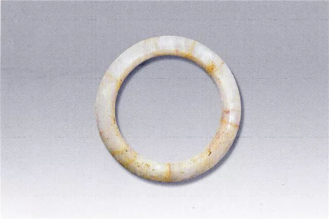 有冰裂,环的两面及内外边缘均呈棱状,由内至外缘渐薄。环外径5、内径3.6、棱厚0.7厘米。中山王族三号墓出土。