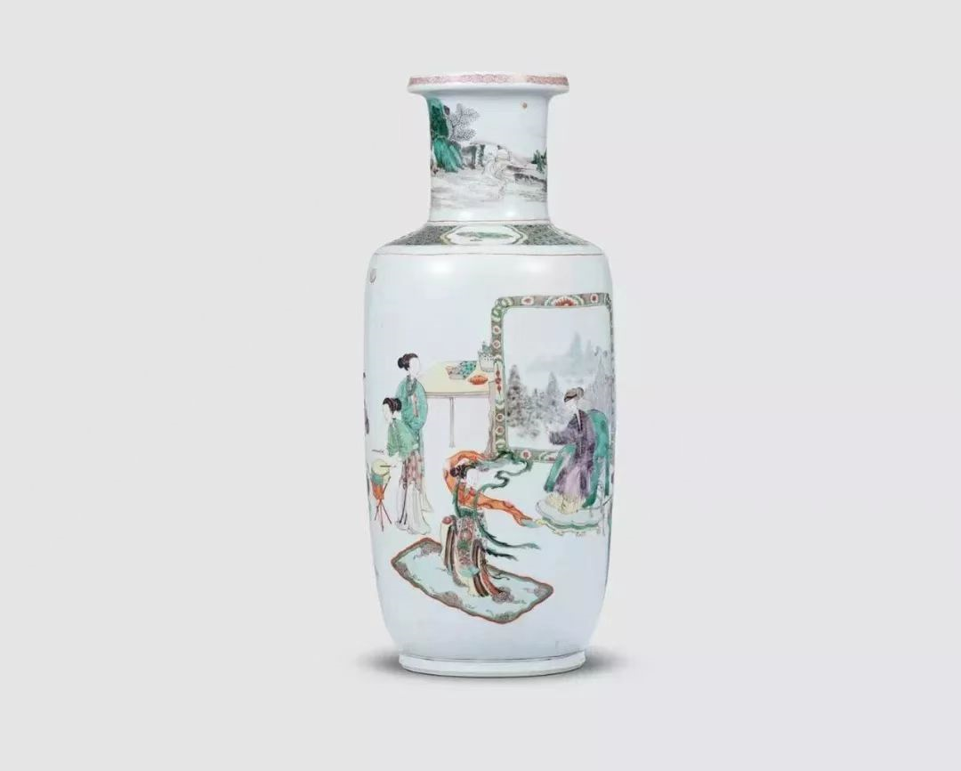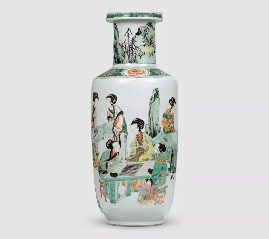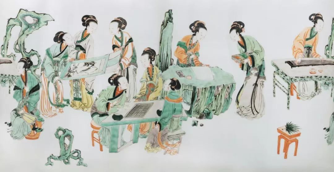 康熙五彩仕女图瓶,描绘一群闺阁女子,在进行文人雅集式的聚会,吟咏诗文、谈论学问、赏玩书画、对弈消遣。此瓶画面人物众多,主要通过分组描绘不同的雅集内容。