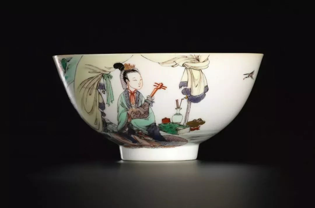 当那些细腻的描写香闺动静的版画被用于康熙五彩瓷器之中,纸墨的黑白被颜色填补,配上了淡雅柔和的五彩色调,才子佳人故事更加动人。