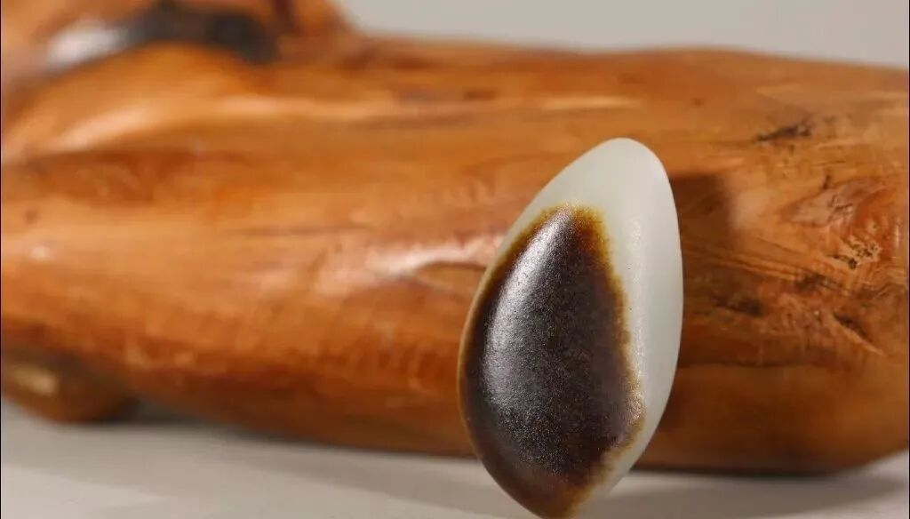 我们经常说老黑皮,说明它的老熟度非常好。黑皮料往往油润性好,看起来冒油的感觉。 入肉三分,也许能形容黑皮的老熟之感。与玉质结合的非常紧密,黑皮是从肉里长出来的,透着一种油性。 黑皮下出高白的几率很大。很多黑皮籽料的白度都特别好,加上黑皮的对比,白度会显得更好。