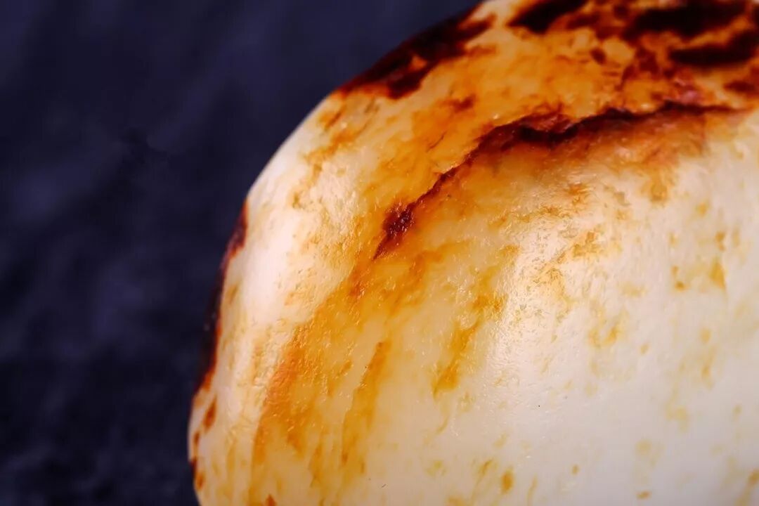 天然的和田玉籽料有一层“汗毛孔”,即和田玉表面形成的无数密密麻麻的小孔,真正的和田玉籽料颜色的边界始终跟着毛孔的边界同步延伸。而人工很难制造出这样的毛孔,因此假玉表面会显得更加光滑亮丽;