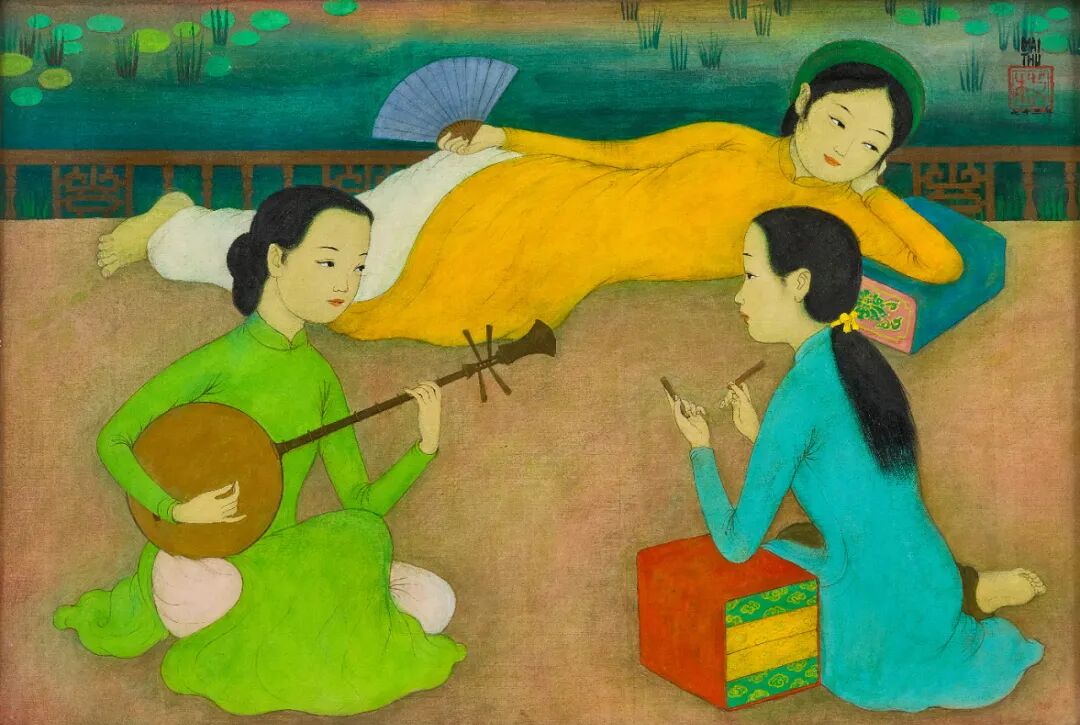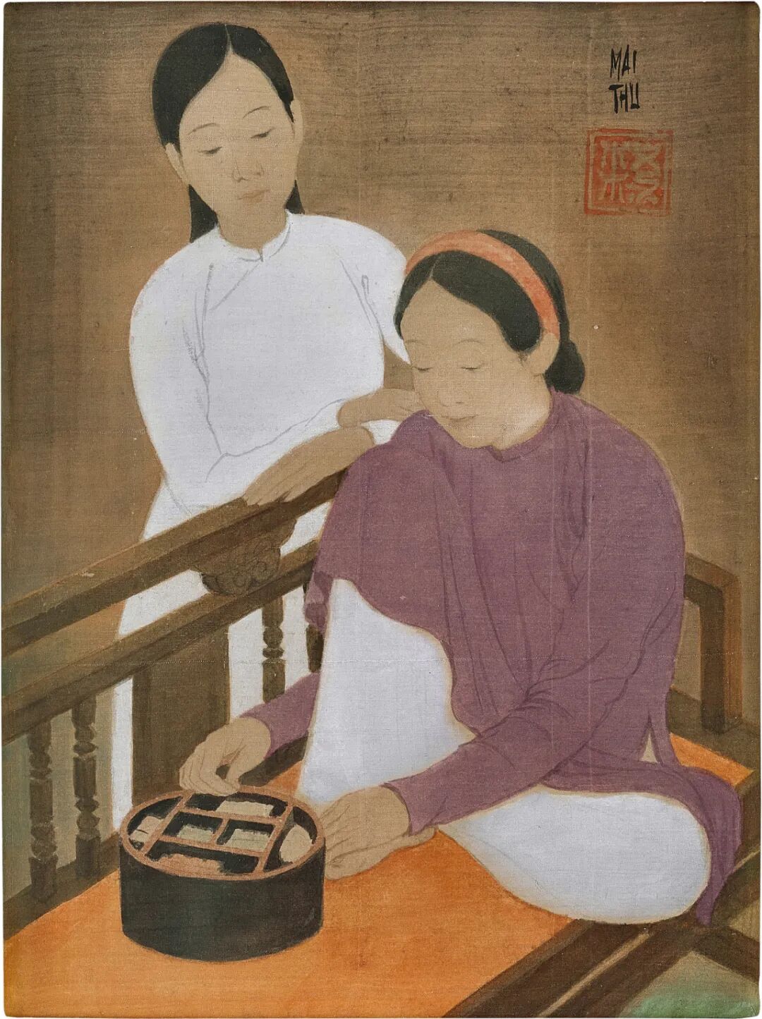 武高谈是越南艺术家「黄金四人组」中的另一位成员,与黎谱和枚中栨一样于河内美术学院毕业后赴法深造。武高谈在法国深受当时备受瞩目的法国现代艺术家影响,其中一位便是马克·夏加尔。《坐姿仕女》颜色鲜艳,线条细腻,是一件体现艺术家精通油画、雕塑以及版刻等艺术形式的精致绢本作品。此作创作于武高谈定居法国后,亦是艺术家决心融合法国与越南艺术特色,以创造独特视觉语言的重要凭证之一。