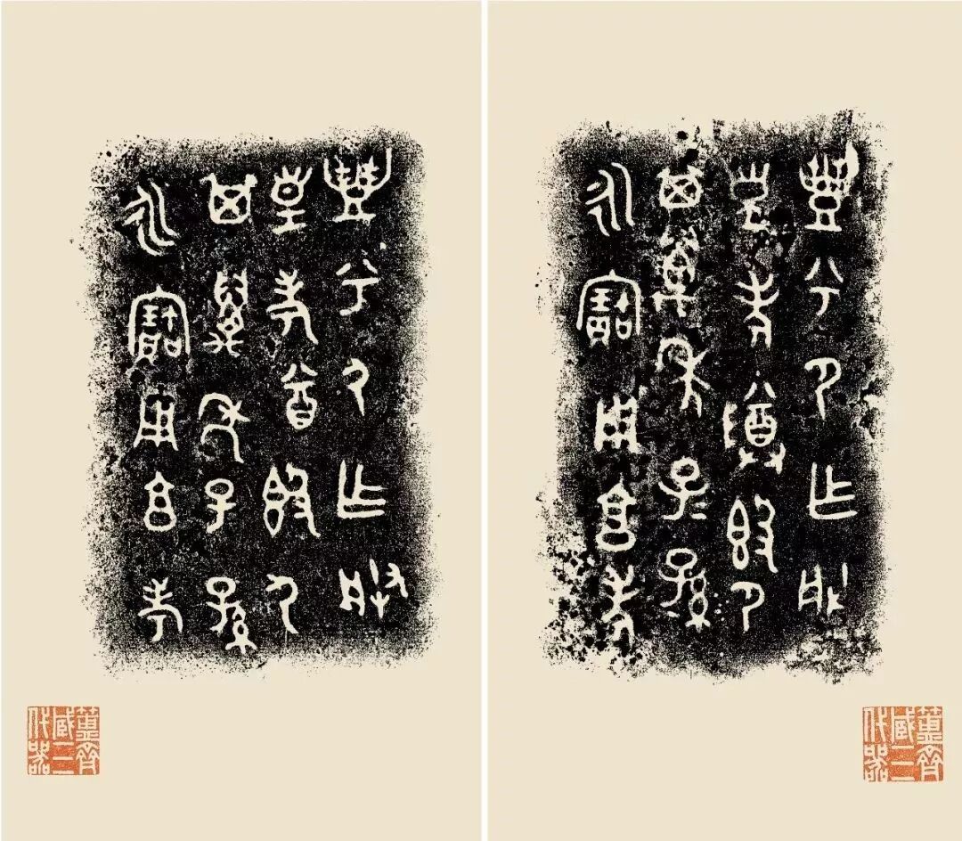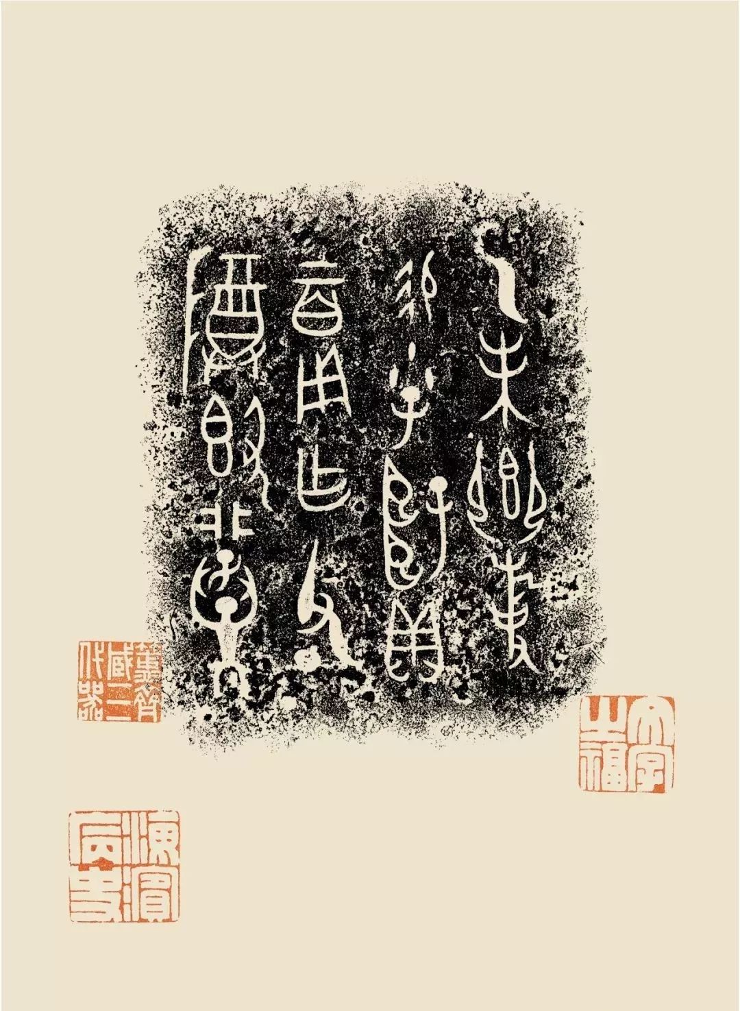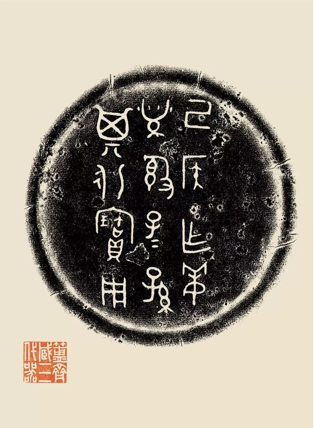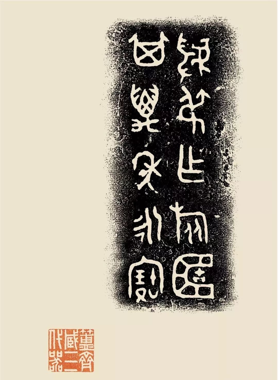 观其铭文用笔从容、娴熟、洒脱而又轻松,充分体现了篆书的“篆引”的感觉;从结体上看,字中有错落,大小有参差;而章法疏落犹“大珠小珠落玉盘”,既平正凝重又流动潇洒。