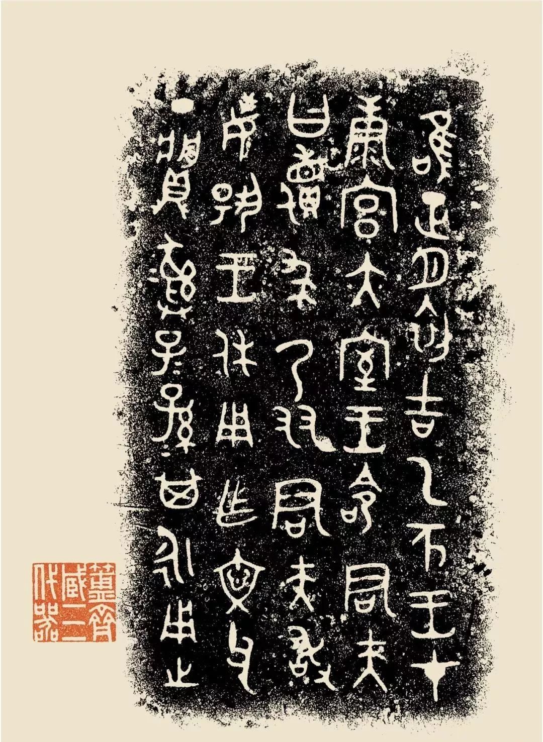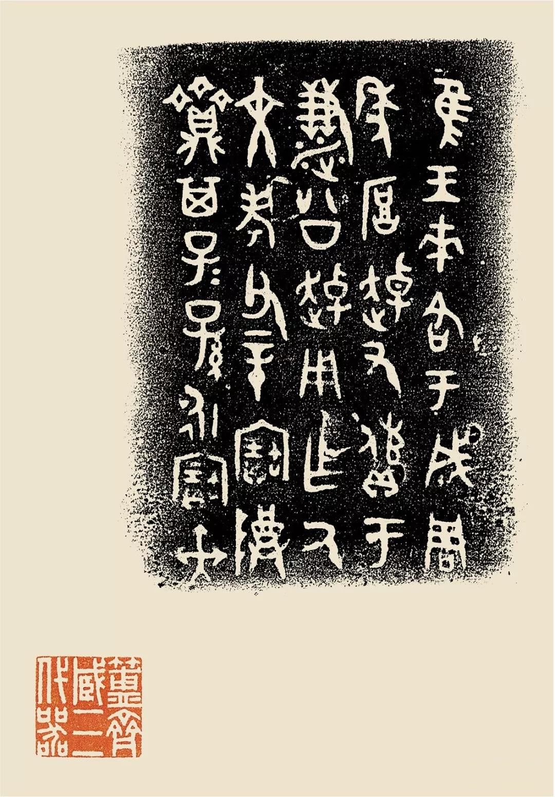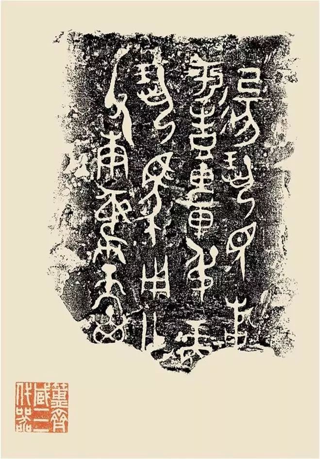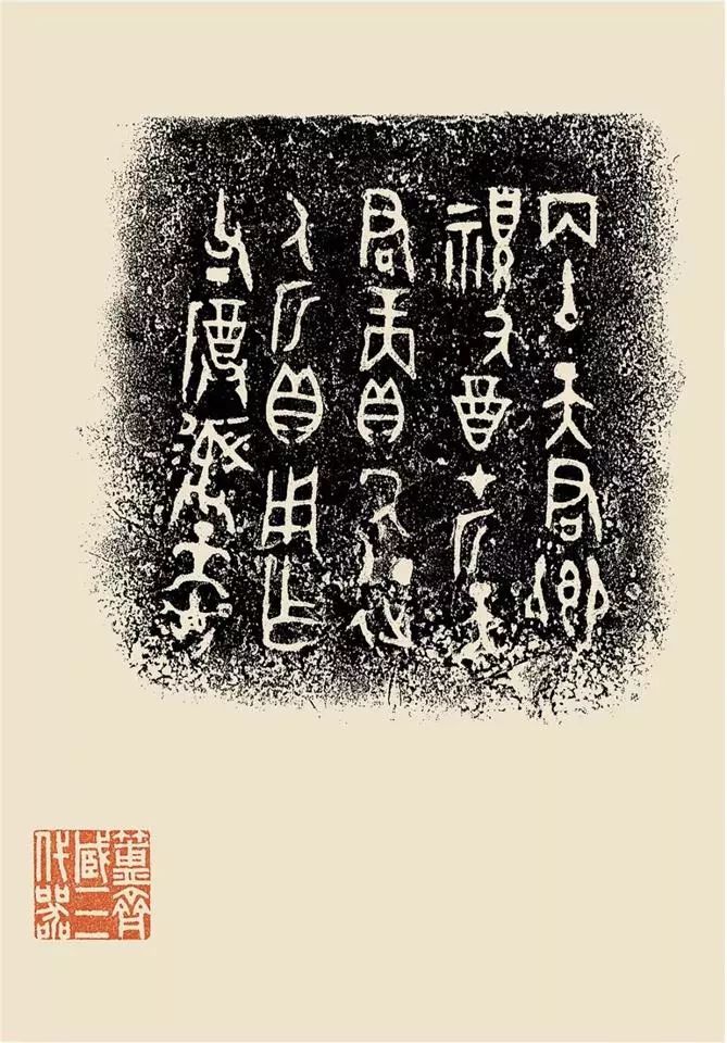 它一反金文规整均匀的格式,宽博欹侧,章法恣肆狂放,率性适宜,初看好像杂乱无章、粗率佻脱,但细品味,便会逐渐体会到其集率意与稳健、稚拙与老辣、空灵与凝重、粗放与含蓄于一身的妙趣。既有金文之凝重,也有草书之流畅,开“草篆”之端。