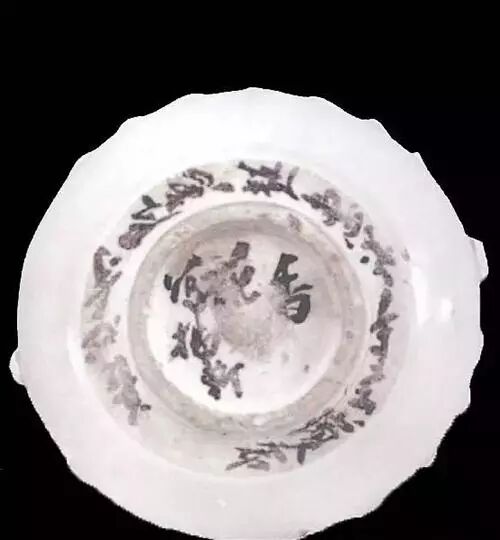 尖唇,六曲花形敞口,斜腹略鼓,大平底,胎极薄,仅0.2厘米。胎色洁白,质坚细。白釉色如凝脂,略见闪黄,莹润光洁,有垂釉痕,施满釉,仅底部露胎。内底划花装饰,为工整纤细的对蝉纹;外底刻行书“官”字款;并墨书“供养舍利太平兴国二年(977年)五月廿二日施主男弟子吴成训钱叁拾足陌”5行28字。盘仿金银器器型,口部无釉。为河北定窑北宋初期产品。