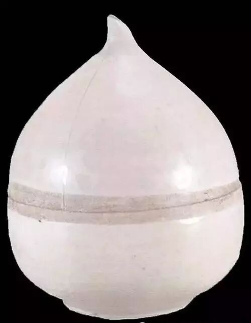 白釉桃形盒 北宋 通高9.5、腹径7.5、足径4.2厘米 1969年河北省定州市贡院内北宋太平兴国二年(977年)静志寺塔基地宫出土,现藏于定州市博物馆。