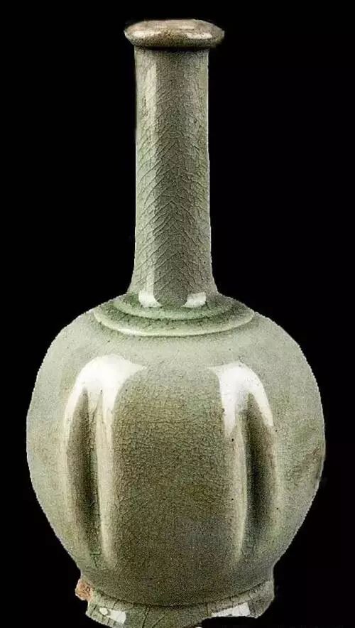 口沿外卷成圆唇,细长颈,圆溜肩,长鼓腹作五曲瓜棱形,矮圈足略外撇。灰白色胎,细密坚质。淡青色釉,布满密集的细小开片,透明性强,光亮润泽,施满釉,足底露胎。器形修长秀丽。陕西铜川耀州窑烧制。