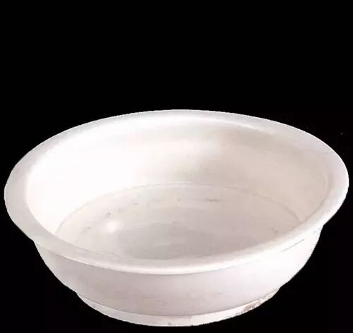 尖唇,折沿下斜,曲腹稍深,圈足外撇;器璧较厚重。胎色洁白,胎质细腻坚硬。釉白如玉,光泽明亮,施满釉,圈足露胎并有窑粘。足心划刻行书“官”字。造型稳重敦厚,美观大方。为河北定窑北宋初期产品。