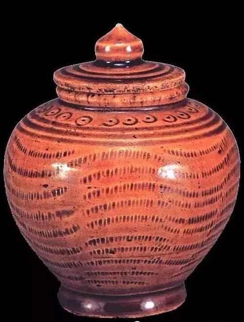 黄褐釉划花盖罐 北宋 通高9.7、口径4.5、腹径7.7、足径4.1厘米 1969年河北省定州市贡院内北宋太平兴国二年(977年)静志寺塔基地宫出土,现藏于定州市博物馆。