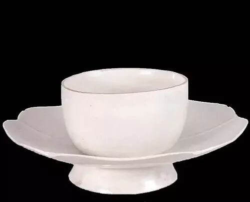 盏,圆唇,直口,深腹,上腹近直,下腹曲收;托,宽沿斜曲上翘,边缘呈五曲花瓣式,高圈足外撇。胎体薄俏,细白胎,坚致。白釉微泛青黄,釉色晶莹透明。盘底足刻划一行书“官”字。为河北定窑北宋初期产品。