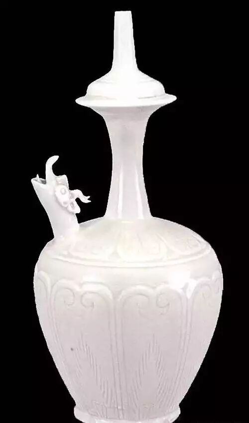 直口,细长颈,中部突出相轮状圆盘,断面略呈棱形,相轮上饰弦纹;圆肩,肩塑龙首短流,龙贴塑双目、双耳及角,张口,上唇尖翘向上;鼓腹,下腹斜收,矮圈足稍外撇。瓷胎细白、坚硬。釉色白泛灰,有垂釉痕,施满釉。瓶腹刻仰覆莲瓣纹。为河北定窑净瓶中的佳品。
