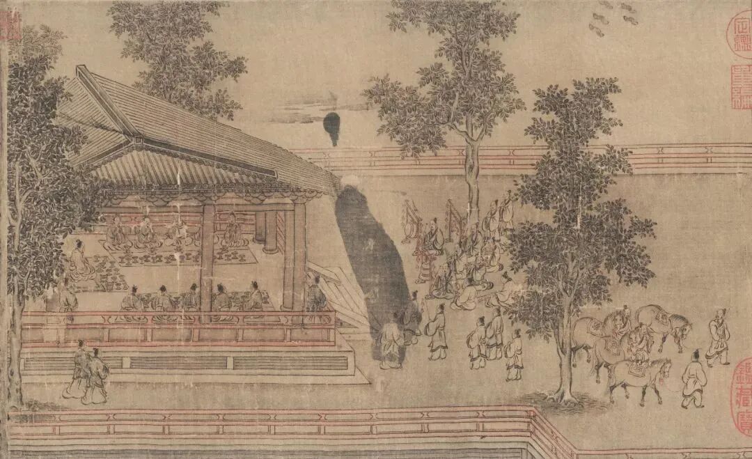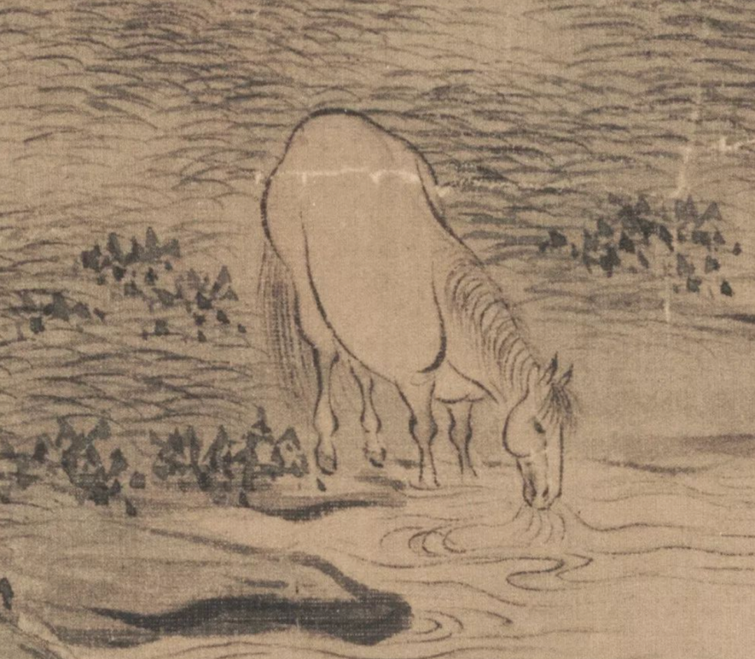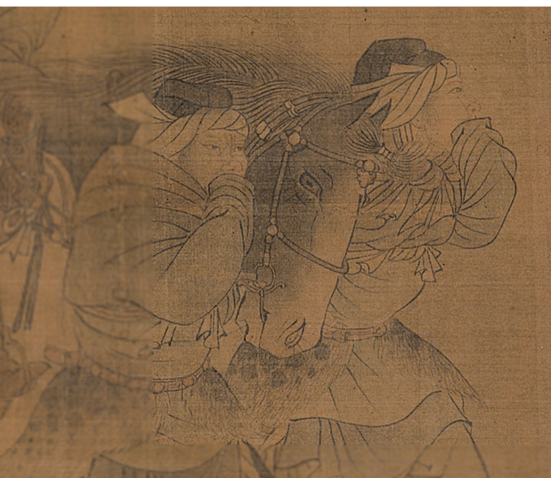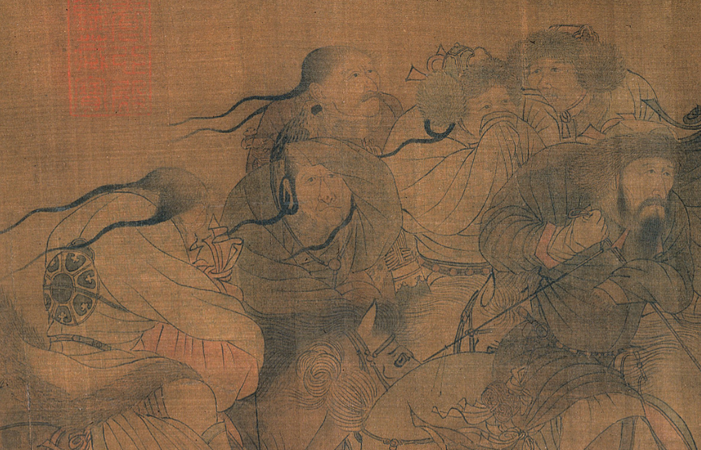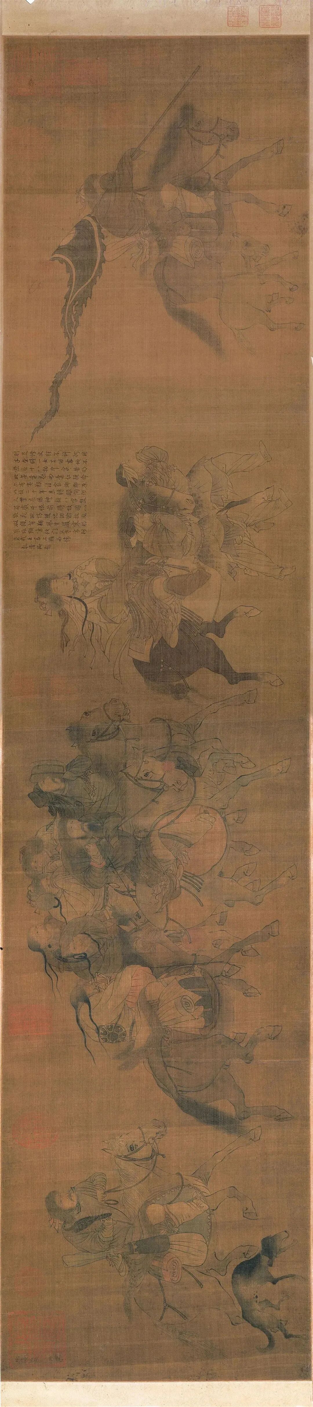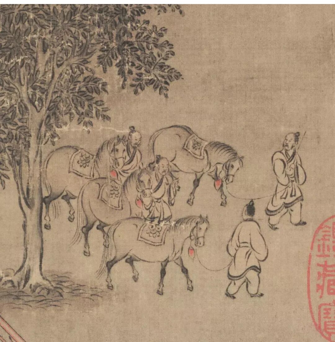 这是金代画家张瑀的一幅作品。画面的非常富有动感很强,细看的地方很多,人物的衣着、动态、表情都很符合人物的身份,重点突出了归汉的行旅场面。