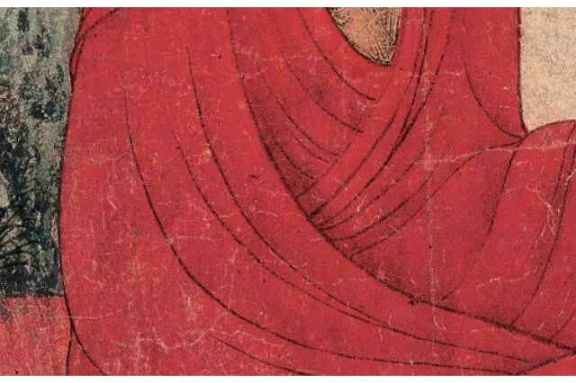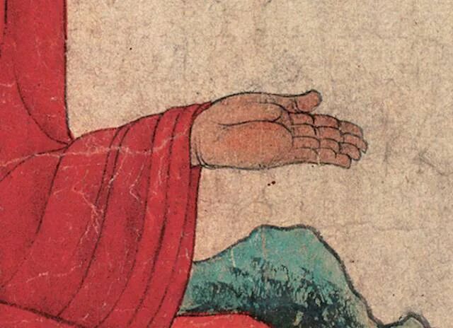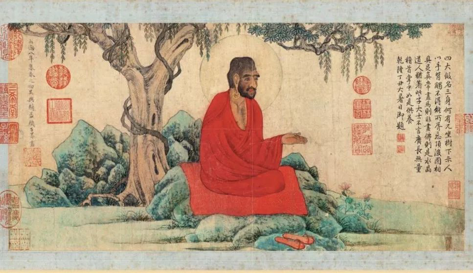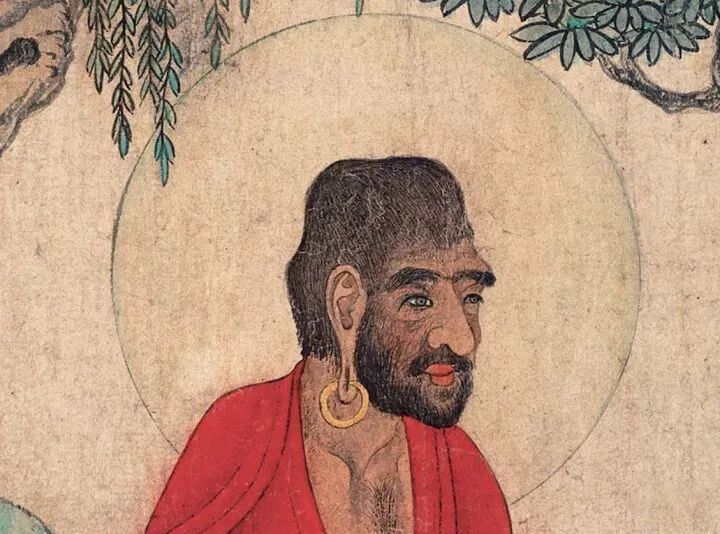 《红衣西域僧图》中,一位身着红色袈裟的僧人盘膝而坐,看他浓眉深眼,鼻子突出,胡须络腮,肤色黝黑,你觉得他是汉人吗?他头上还有光环,说明他已经不是一个普通的僧人了,而是得道修成,成为一个脱生死的罗汉了。