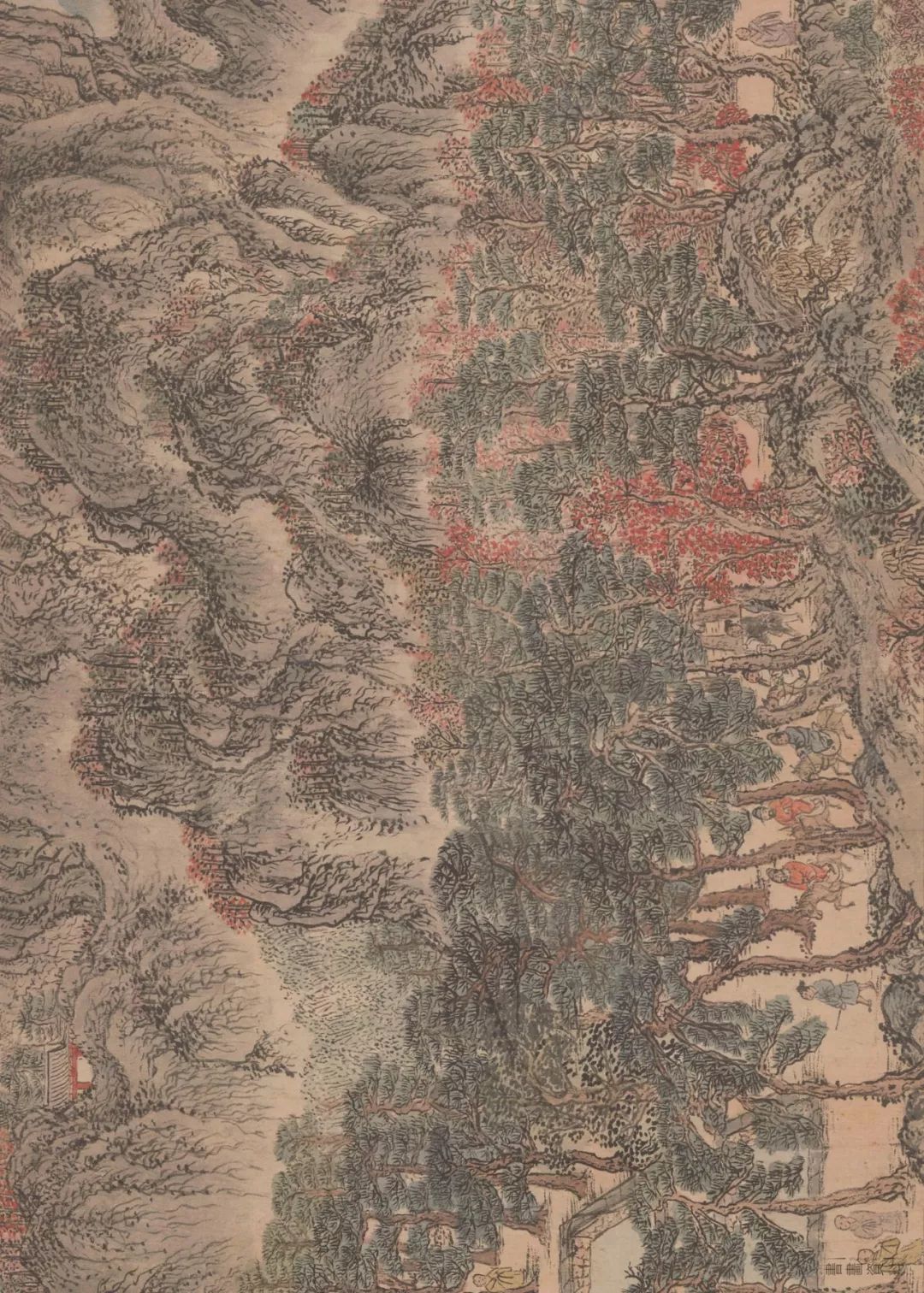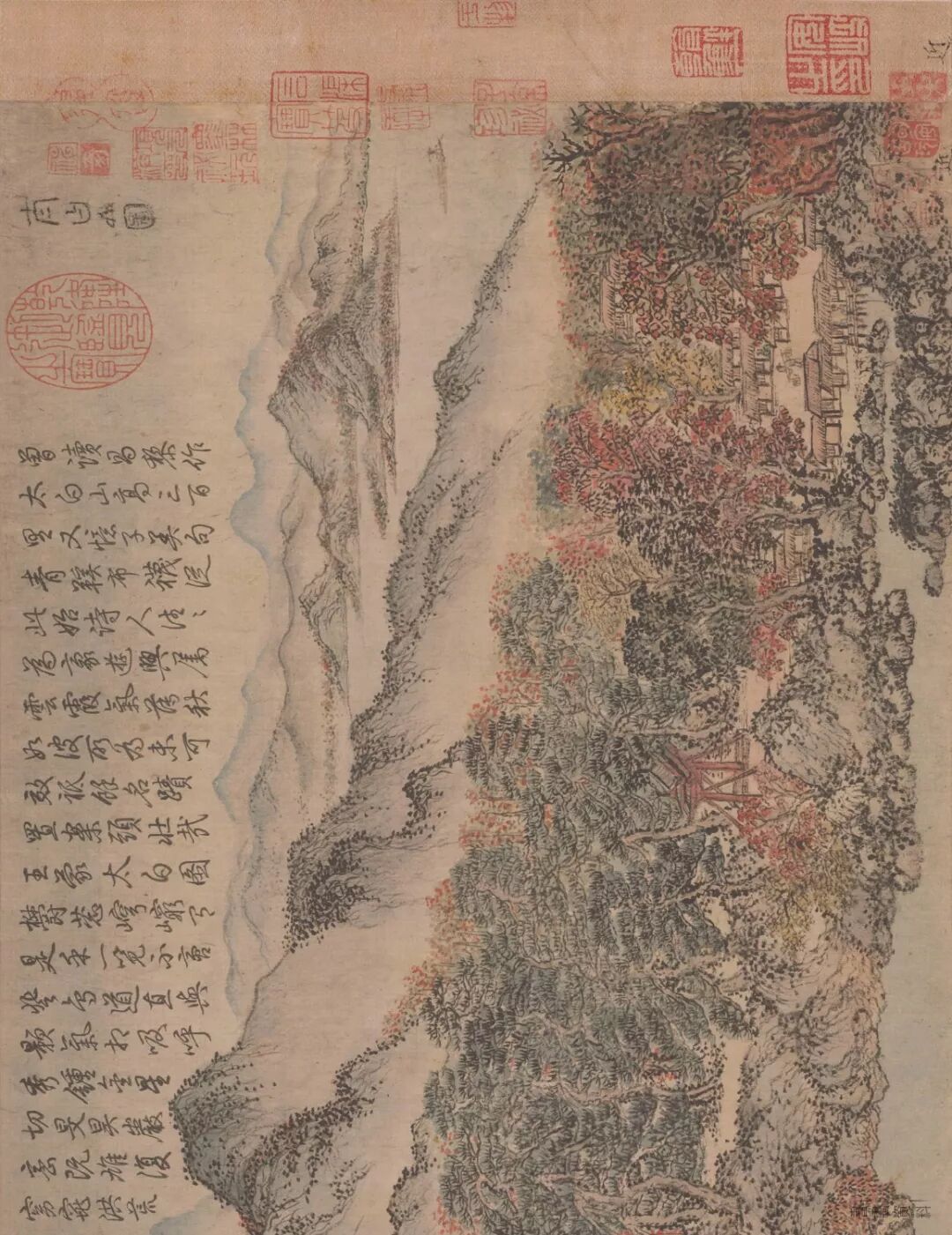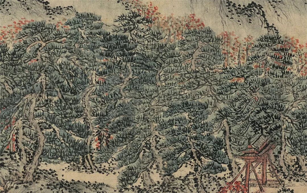 在画里,有苍郁茂密的松林,有寺庙楼阁,有草堂屋舍。整个画面着色较重,山青叶红,一派山间田园秋景。