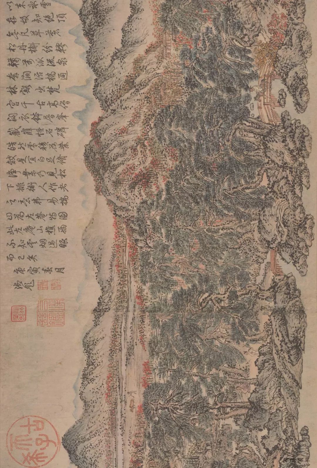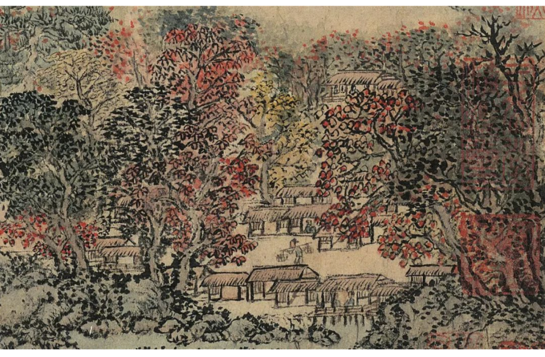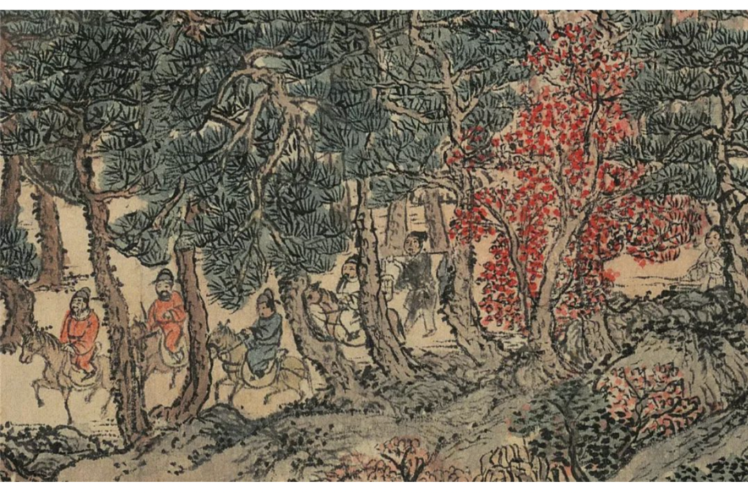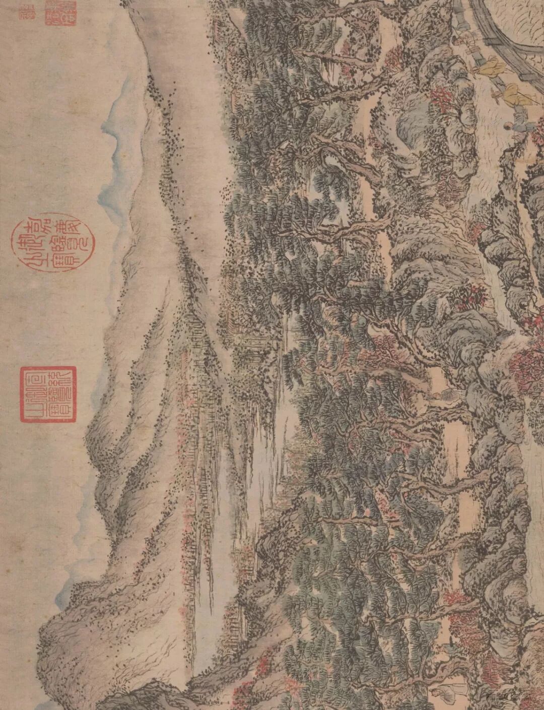 在画里,有苍郁茂密的松林,有寺庙楼阁,有草堂屋舍。整个画面着色较重,山青叶红,一派山间田园秋景。
