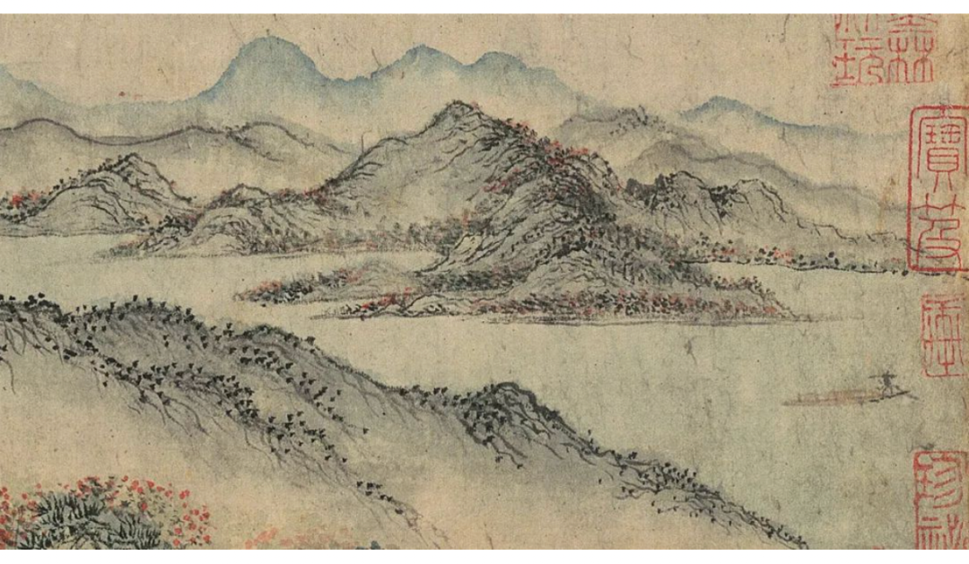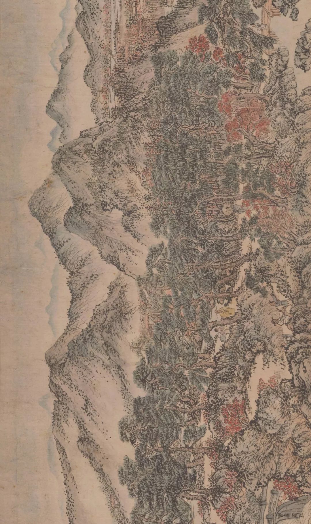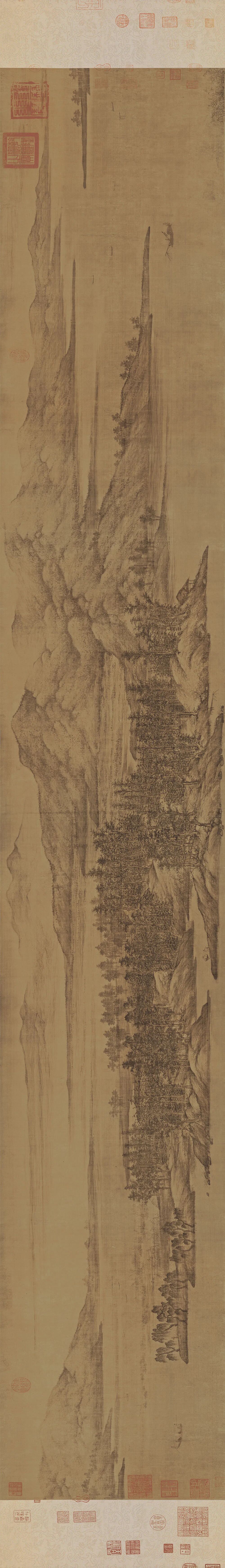 从整体上看,画卷中的山脉向左右延展,尽量压低我们的观看视线,同时增加远景的层次,就像是在一个环绕的3d画面之中。
