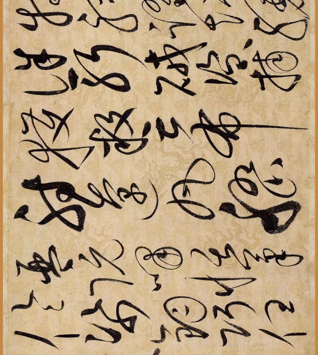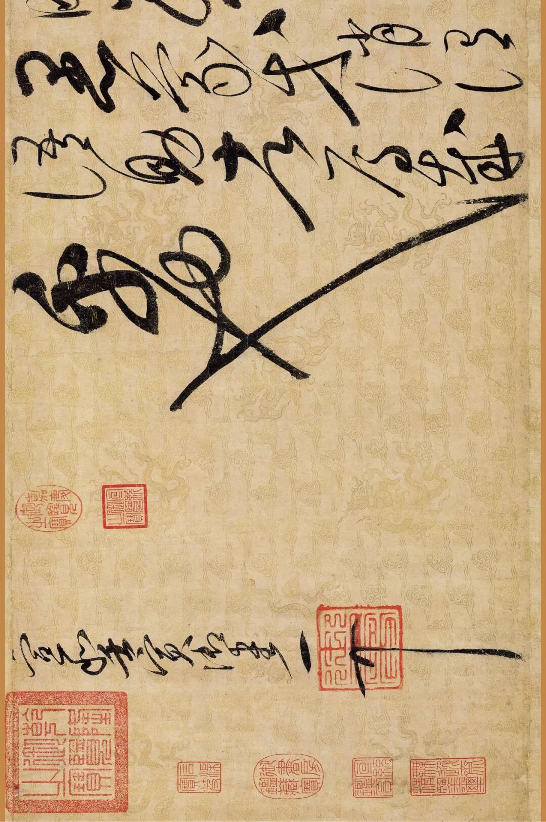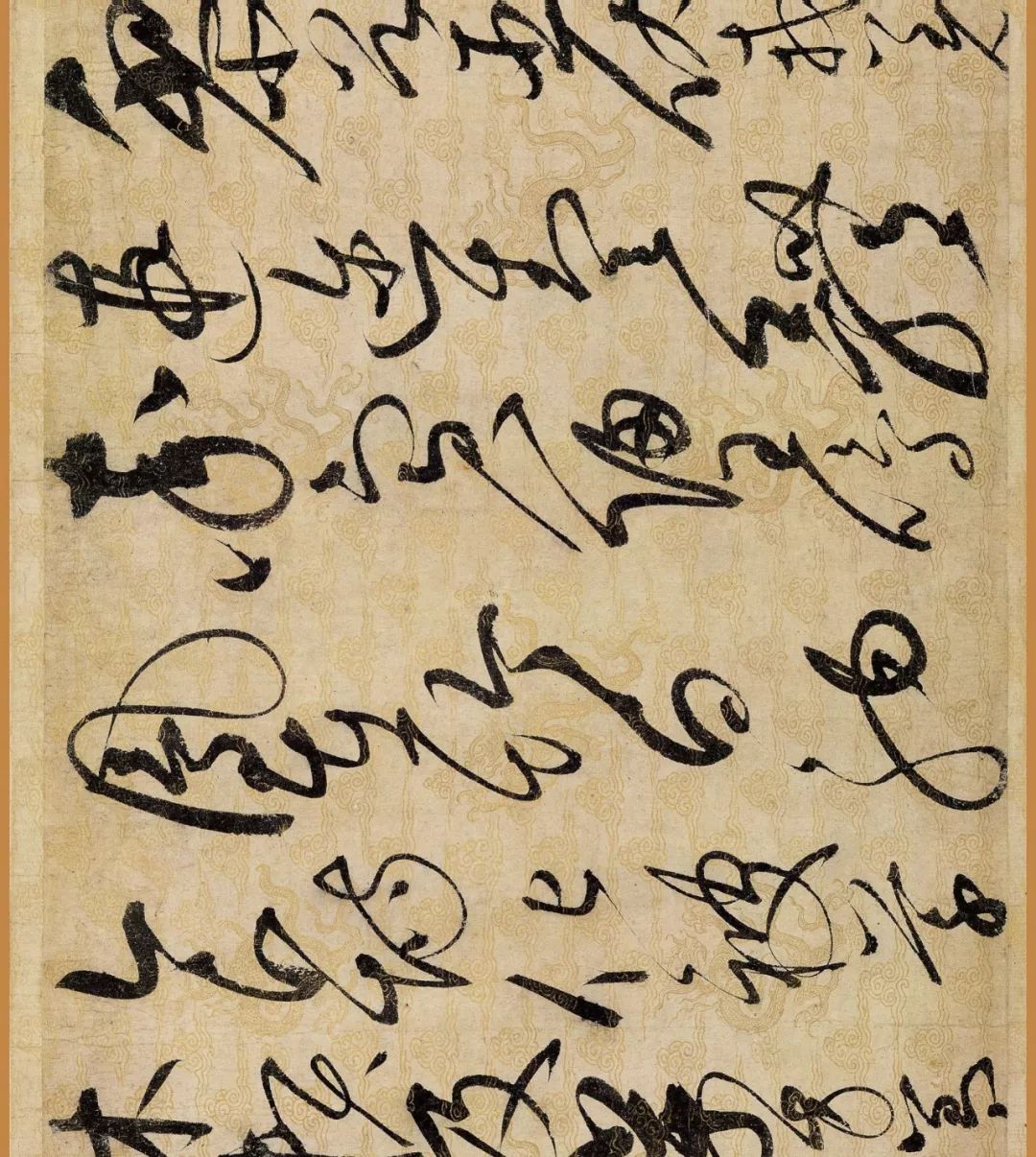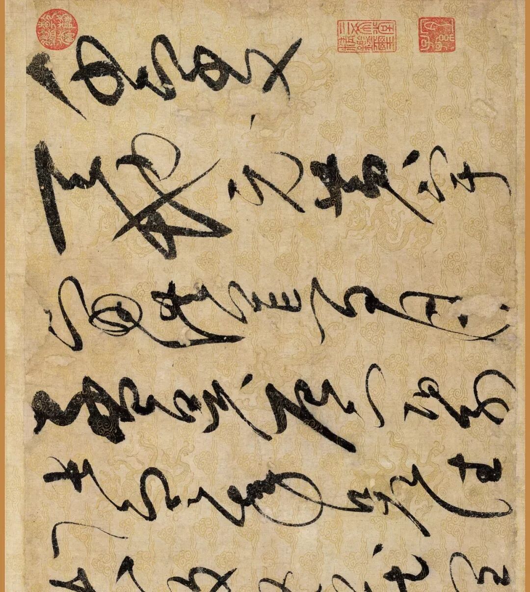 据说这幅作品是赵佶40岁书法大成时的作品。对了,你还要仔细看下它的用纸哦,是描金云龙纹纸。