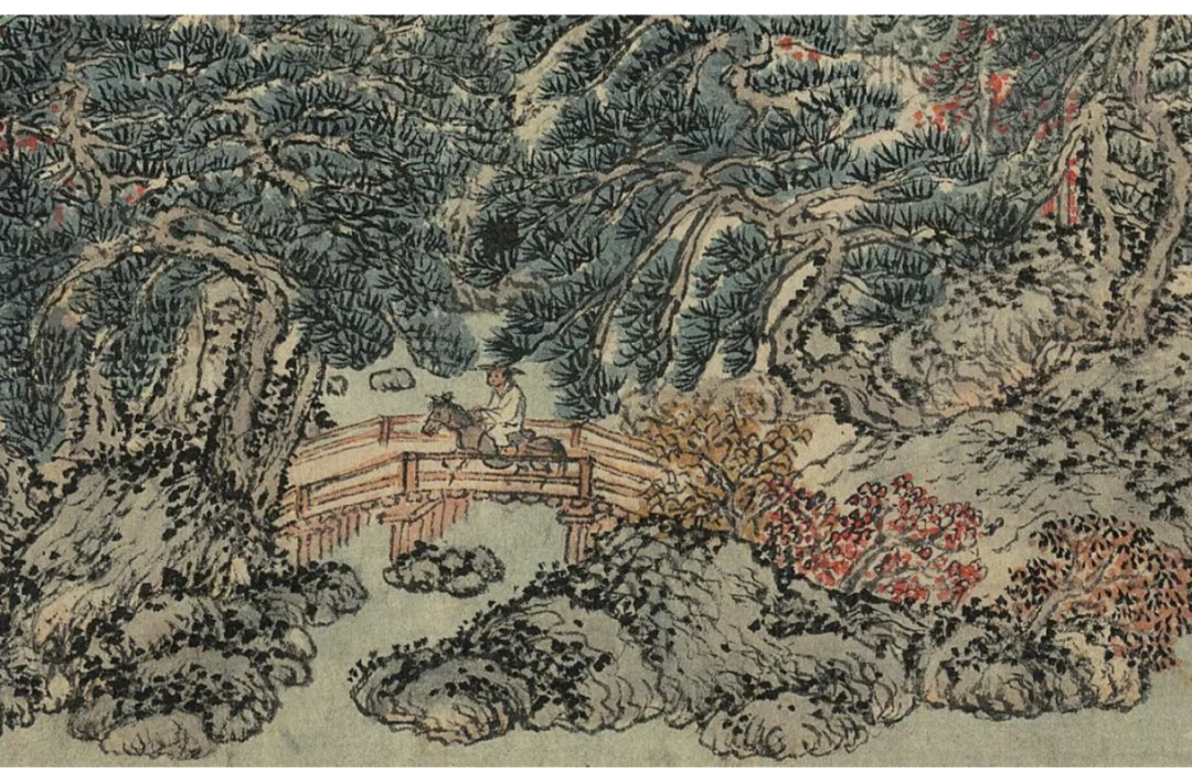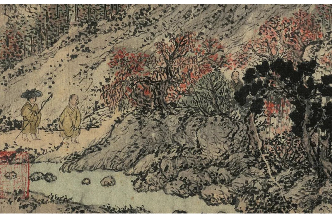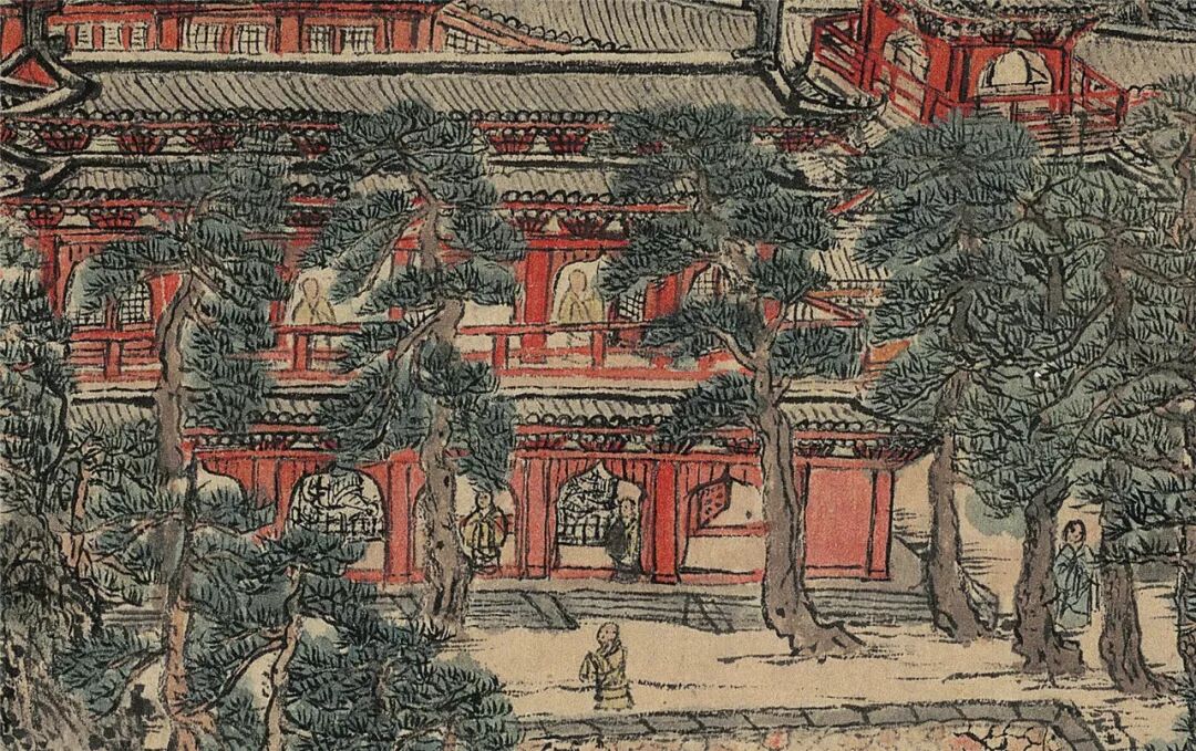 值得注意看的是,最后画的就是天童寺,它坐落于山谷之中,我们还能看到僧人悠游于松林庙宇之间。