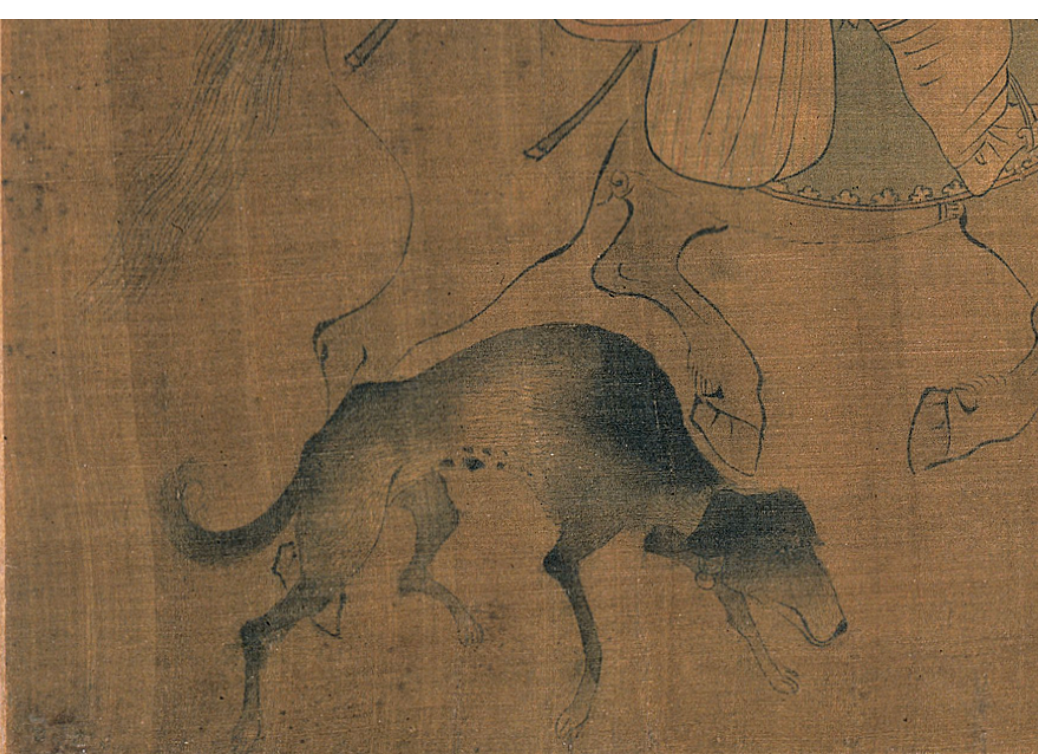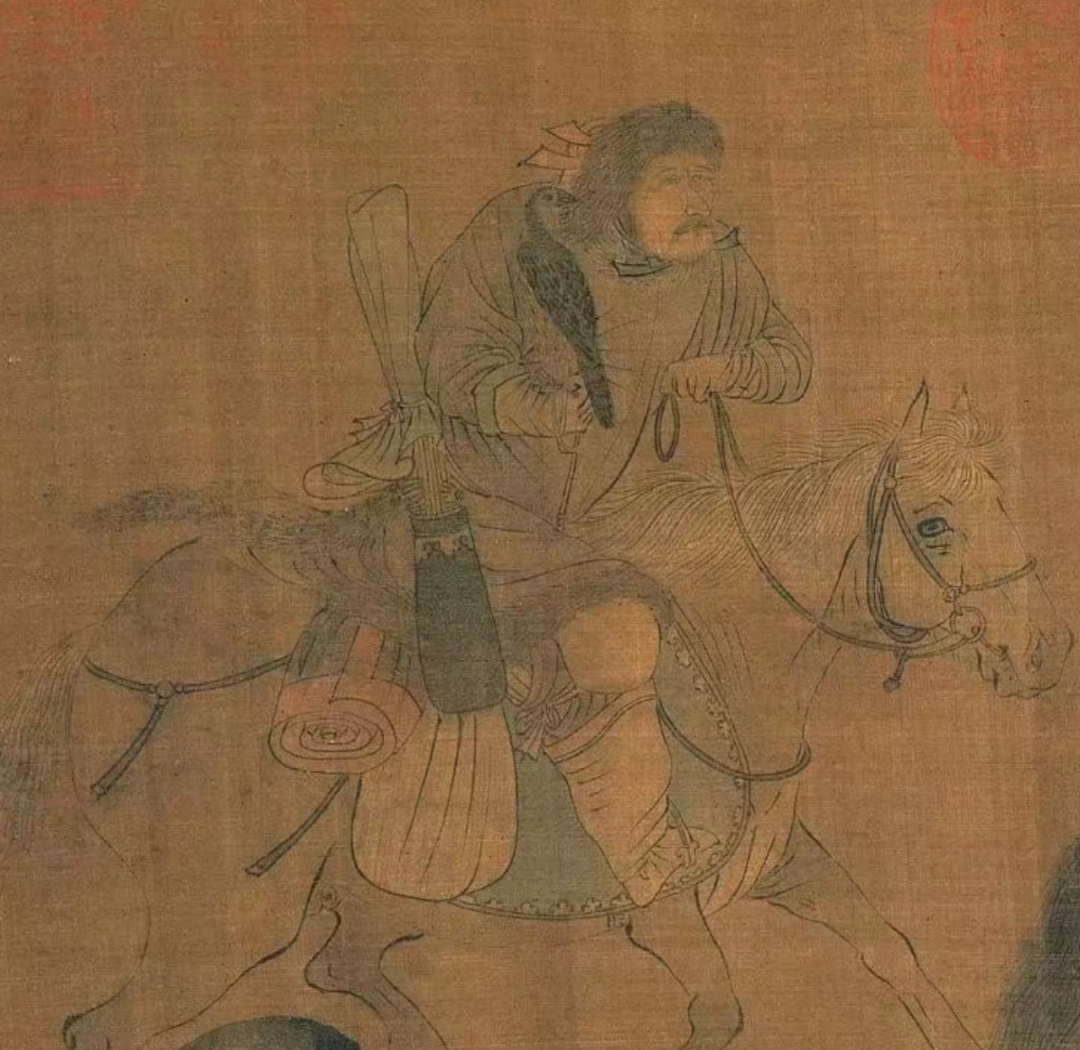 一位头戴皮帽、身潸窄袖长袍的武士,他腰携箭饩、右手架鹰、左手执缰,正驱马追赶行进的队伍,马旁还紧跟一猎犬。