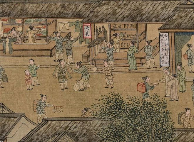 大街上有走街串巷卖刀具的、推销自家商品的,门店有卖雨具的,旁边还有专门的女工店。