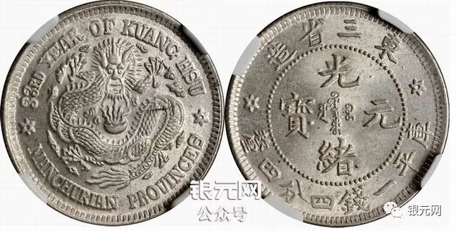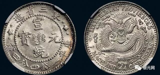 该币正面中间钤汉、满文“宣统元宝”,珠圈外上钤“东三省造”,下钤库平一钱四分四厘,左右分列花星;背面中央蟠龙,上下钤英文“first(1st)year of hsuan tung”“manchurian pvovinces”,( 另有上钤“manchurian pvovinces”下钤“1 mace and 4.4 candareens”),左右分列花星。