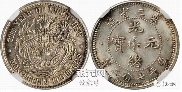 同年由度支部造币天津造币总厂代东三省铸造银元,面值有四,分别是库平七钱二分、三钱六分、一钱四分四厘、七分二厘,其中一钱四分四厘常见,其余稀少,由于是天津造币总厂代铸,因此龙形与北洋龙基本相同。库平一钱四分四厘币正面中间钤汉、满文“光绪元宝”,珠圈外上钤东三省造,下钤库平一钱四分四厘,左右分列花星;背面中央蟠龙,上下钤英文“33hd year of kuang hsu”“manchurian pvovinces”,左右分列花星。