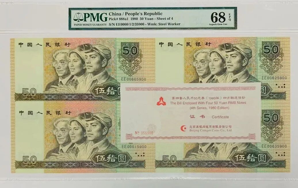 怎么区分原版还是裁切版,很简单,你只需看1980年版50元,8050四连体只有两种冠号,是:EE、BJ,而当年发行原版的8050并没有这两个冠号,意思就是8050是这两个冠号的就是裁切版,不是就是原版,当然前提是真币。话又说回来从钱币本身来讲,8050四连体本是真币,无非是连着的自行裁开。可一直以来,大家总感觉这种裁切的8050算不上正统。