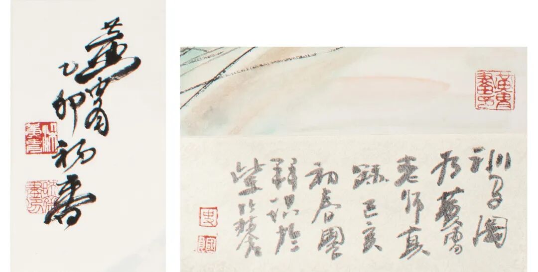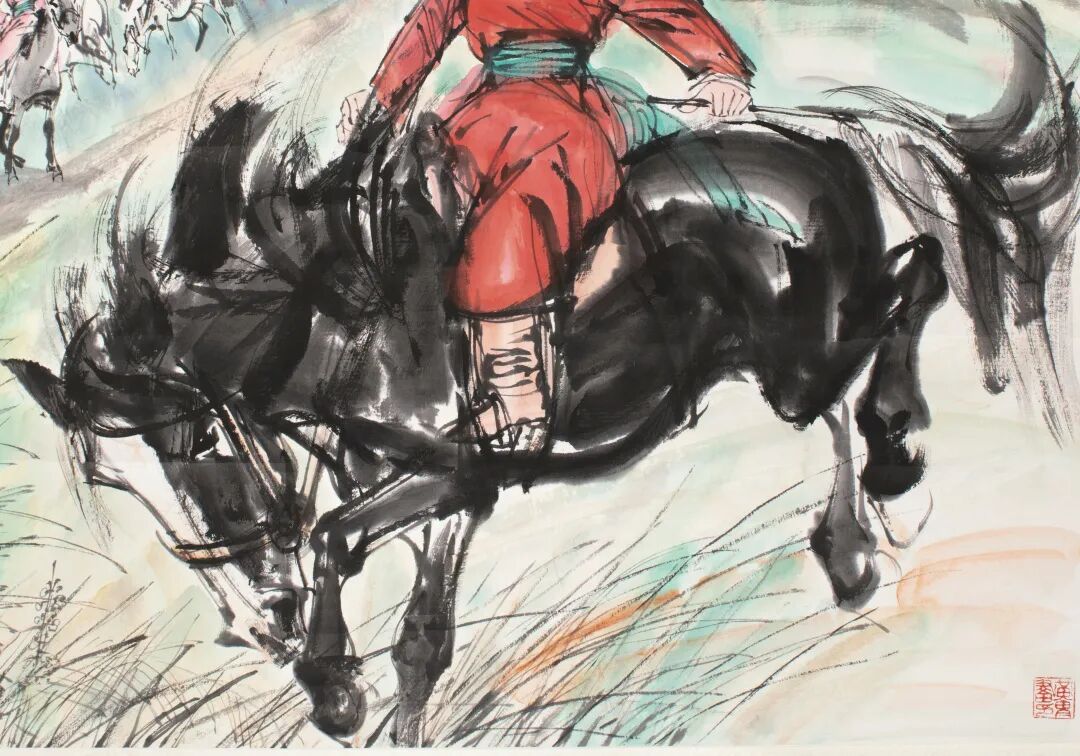 红衣少女则一只手紧握缰绳,另一只手手持马鞭,双腿紧夹,面带微笑,神情坚定,毫不畏惧,对驯服这匹烈马胸有成竹,一人一马形成紧张的对抗局面;同时,骏马墨色浓厚热烈,与少女的红衣形成鲜明的对比,使画面极具张力。在远景中,画家以减笔绘制出围观的牧民以及草原上的马群,以浅浅的青绿色调烘托远近草原,画面空间显得完整而辽阔。