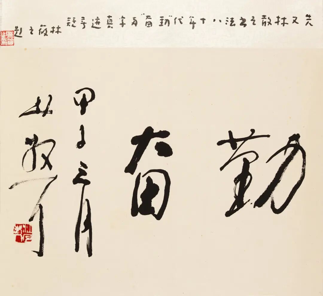 边跋:先父林散之书法八十年代“勤奋”两草字真迹无疑。林筱之题。钤印:林筱之印
