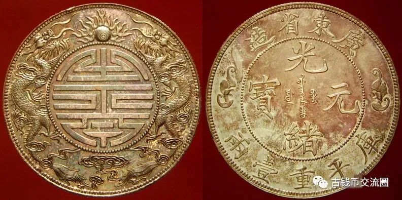 “广东双龙寿字一两银币”,直径约 41 毫米,重约 38 克,制作精良。正面以珠圈为界,可分为内外两个部分:珠圈以外,上端为“广东省造”四字,下方为“库平重一两”五字,左右两侧各铸一蝙蝠图案;珠圈以内,铸有满、汉文“光绪元宝”四字。背面也以珠圈为界:珠圈外面,铸有双龙图案;珠圈内,铸有一圆形“寿”字。“蝠”与“福”同音,与背面“寿”字相呼应,构成“福寿双全”之美好寓意。
