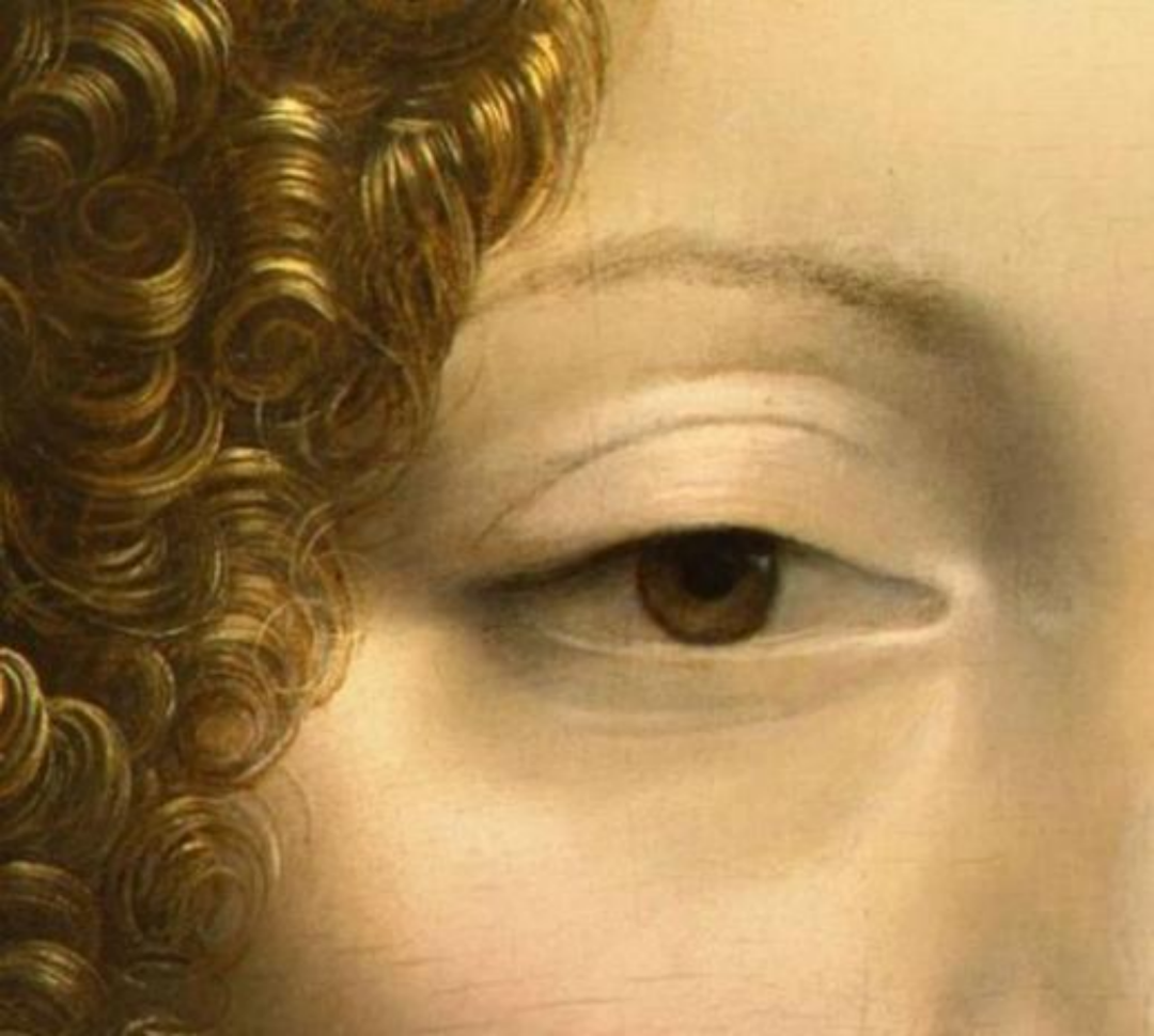 图12(左上) 达芬奇 《吉内芙拉像》(Ritratto di Ginevra de’ Benci)局部:各种螺旋状的头发;木板油画,38.8 x 36.7厘米,华盛顿国家画廊,约1475
