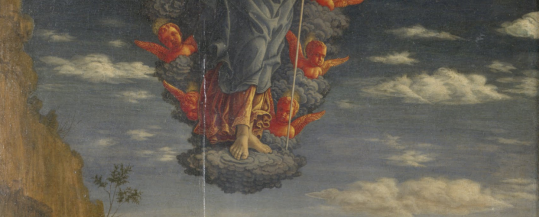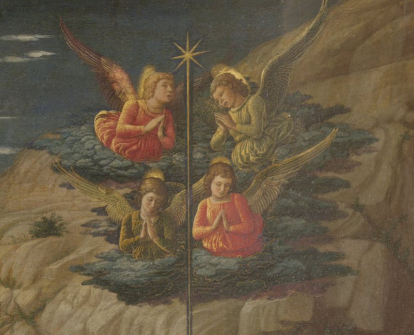 图16(上) 安德里亚曼特尼亚,《耶稣升天》(Ascension of Christ)局部:云上的耶稣与天使;木板蛋彩画,86 x 42.5厘米,乌菲齐美术馆,佛罗伦萨,1460-1464