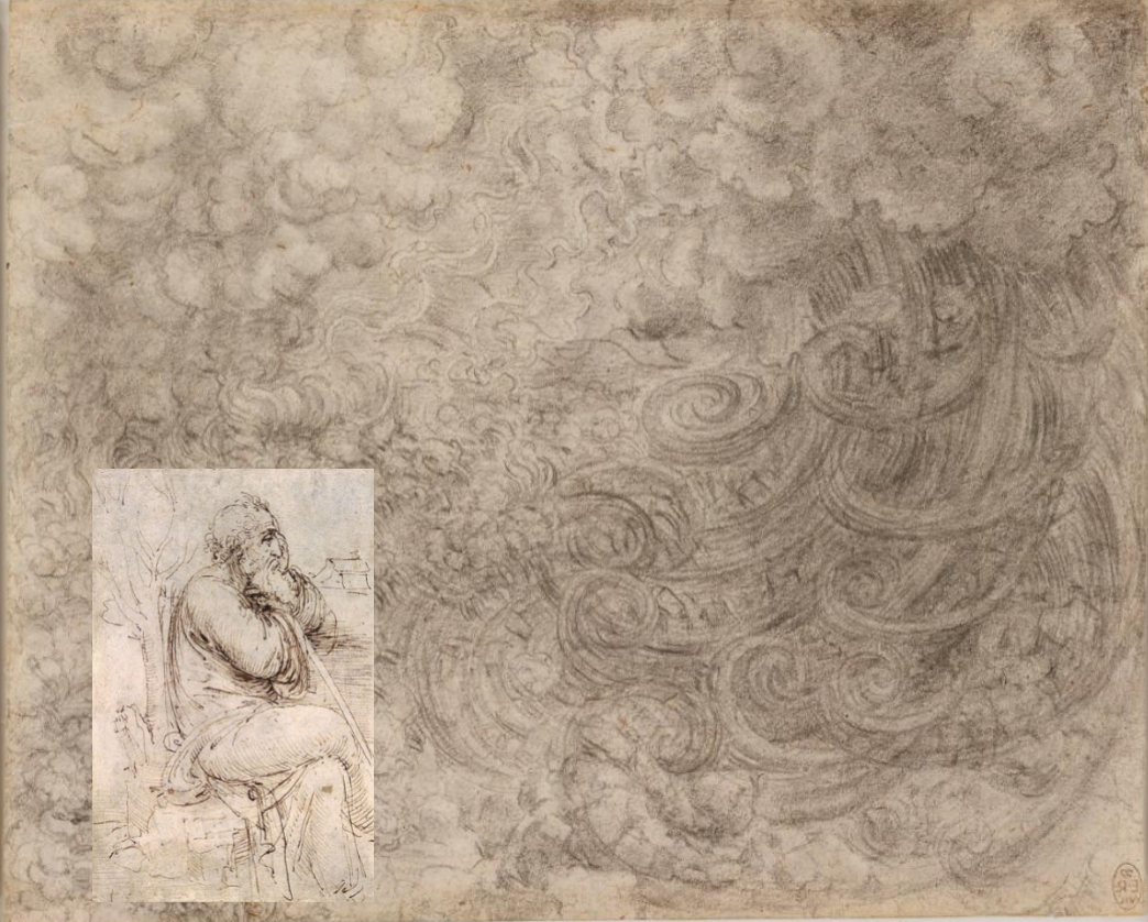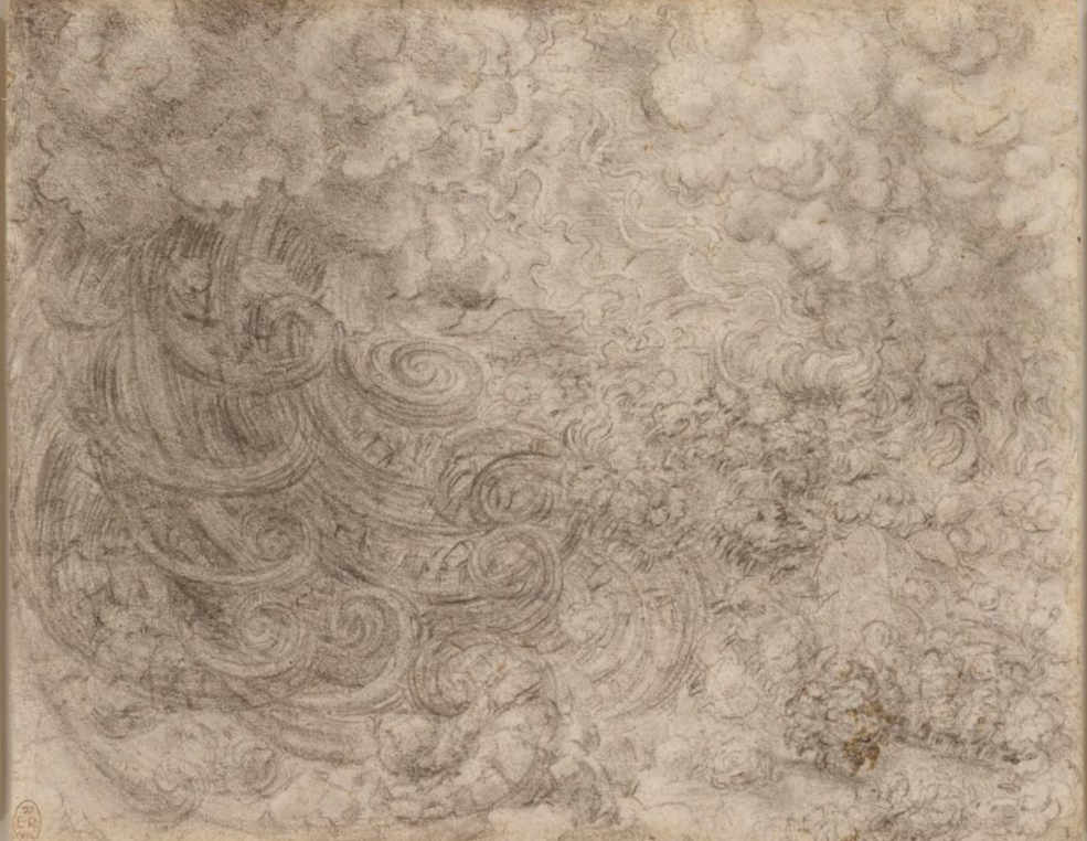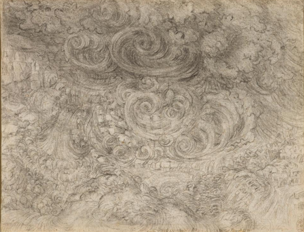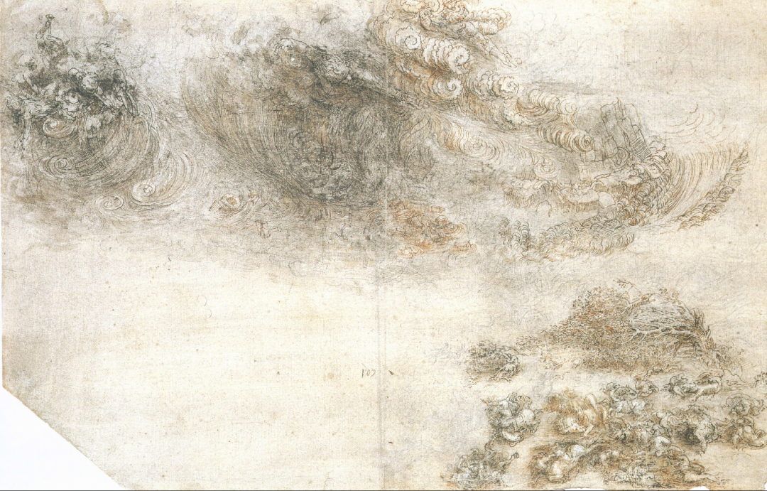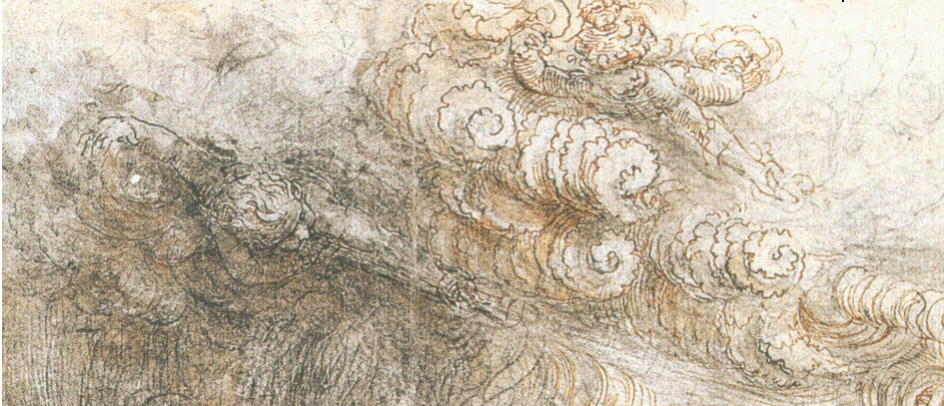 不过,对我们来说更重要的,是达芬奇这类“龙图”中都有的螺旋状龙尾;这类龙尾在达芬奇同时期的素描稿中大量出现(图8、图9)。这些图中,描绘和捕捉家猫动态的图像,与圣乔治与龙搏斗的图像相互交织在一起,予人以这样一种印象:仿佛家猫和马一转瞬间就变成了盘旋的龙,或者龙本身即与家猫、与扭曲交缠的马和骑士,是同一种内蕴着的力量。与此同时,当我们把眼光放到更广阔的空间,即可发现这一时期他最关心的自然现象,居然是席卷一切的风暴与洪水(图10);而在风暴与洪水之中,最鲜明夺目的意象,仍然是那些螺旋和涡卷——此时此刻,达芬奇笔下的“龙”早已超越了传统西方式代表“”势力的负面形象,而成为东方式的代表大自然那从水流、发卷到风暴贯穿一气、永不停息、周而复始的伟大动能本身(图11、图12)。
