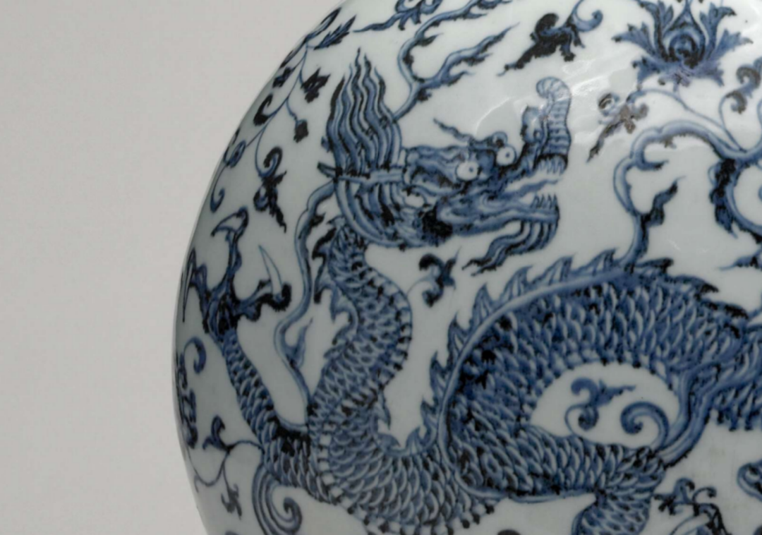图6(左下) 《青花龙纹天球瓶》局部:张牙舞爪的龙;高44.6厘米,明永乐(1403-1424),British Museum,London