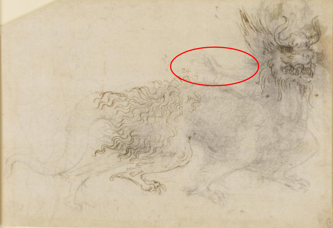 在以上分析基础上,我们再来看达芬奇生前所画的最后的“龙”(图3)。今天的学者将这条“龙”的年代,确定在1515-1517年间,也就是达芬奇从罗马到法国之间的岁月;因为它在运笔风格上与一批纸上有法文水印痕迹的素描十分接近,尽管它所在的纸上是一枚意大利文水印;并认为这条“龙”与那批人像素描一样,都是对宫廷戏剧或盛典演出时演员服装的设计图[11]。这条“龙”先用黑色粉笔(blackchalk)以如烟如雾缭绕的线条打底,然而再在局部(主要是头部和身体)用墨水笔勾勒具体细节。“龙”头细节的刻画尤其令人想起他在《笔记》中透露的画“龙”方法论,即从熟悉的“狗头”和“猫眼”处化出。这条“龙”身上最奇特的地方,在于它在“龙”头左侧,突兀地横生出第五条腿爪(图3红圈所示)。