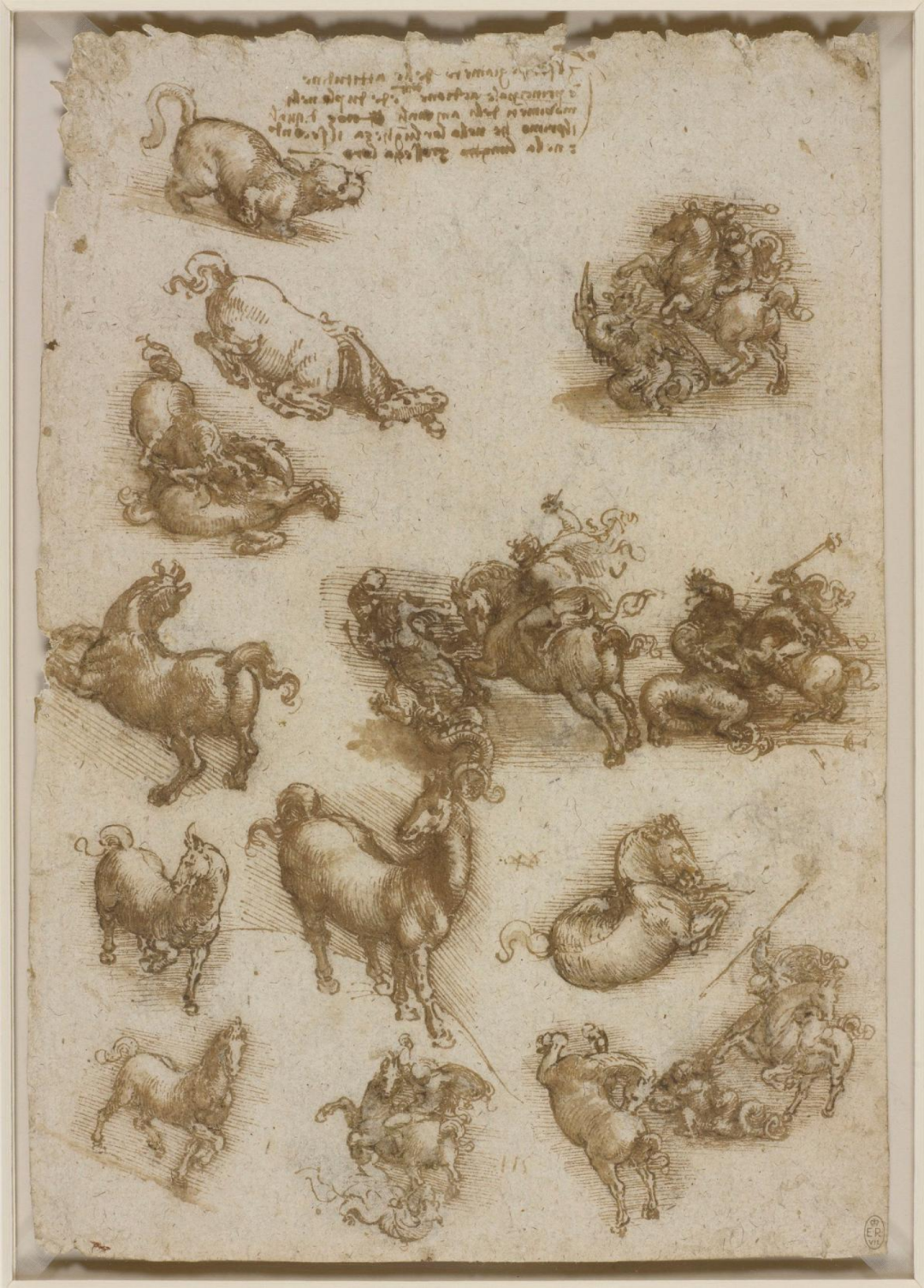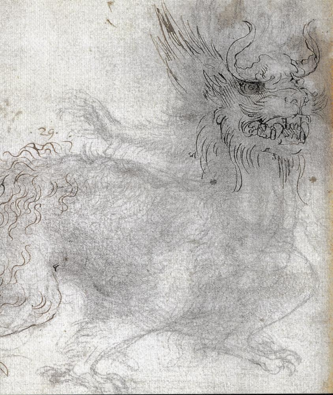 图1(上) 达芬奇门徒《龙狮之搏》(Fight between a Dragon and a Lion), 素描,Uffici Gallery, Florence