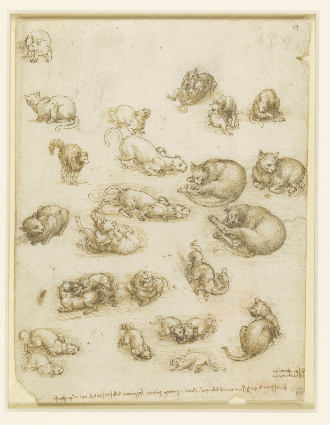 图8(左) 达芬奇 《猫、狮子与龙的研究》局部:猫与龙;素描,27.0 x 21.0厘米,Windsor Castle,Royal Library,12363, 约1517-1518