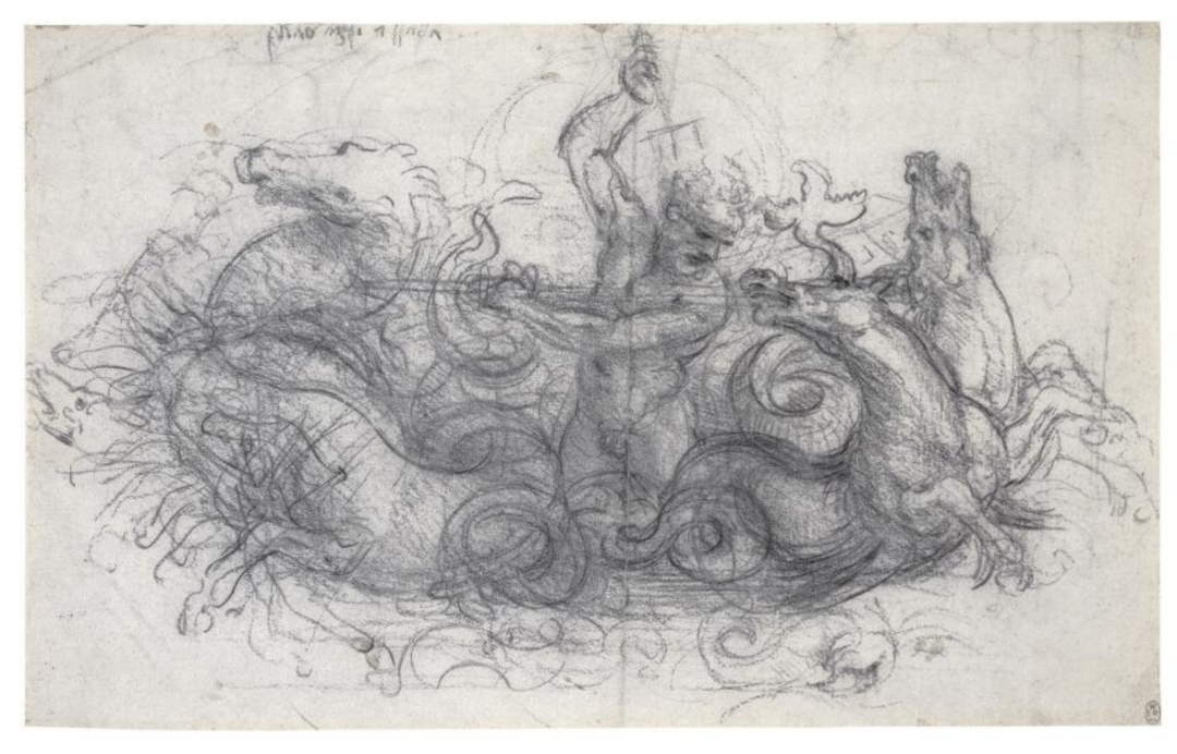 图2(下) 达芬奇《海神尼普顿》(Neptune),素描,25.1 x 39.2厘米,Windsor Castle,Royal Library,12570, 约1504-1505