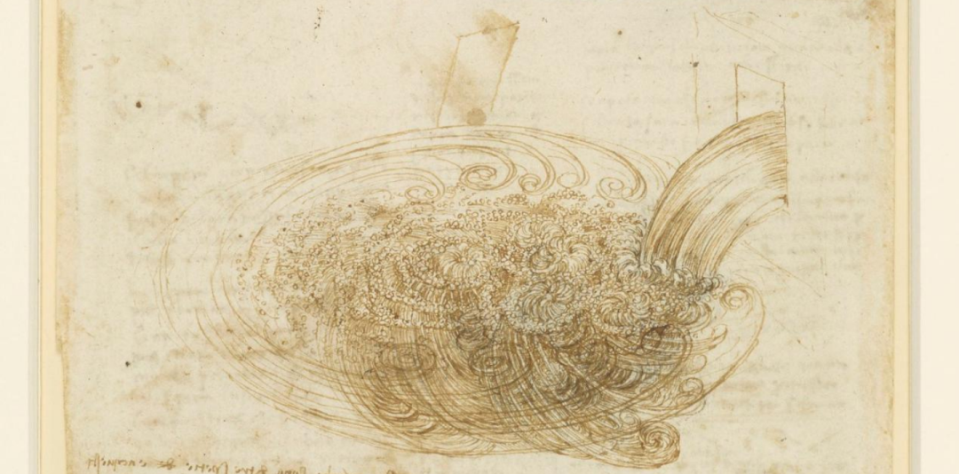 图29 达芬奇 《流体力学涡流研究》(Studiesof Hydrodynamic Turbulence)局部:倾泻而入的水流与涡旋;素描,Windsor Castle,Royal Library,12660v, 约1508-1509
