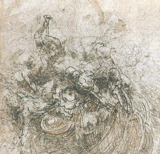 图30 达芬奇 《席卷风景和骑士的大洪水》(cataclysmic deluge overlandscape and horsemen)局部:兴风作浪的海神和风神(?)