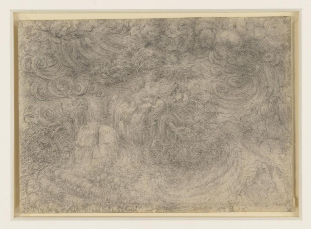图28 达芬奇 《雨云倾覆岩树的大洪水》(cataclysmic deluge with raincloudsoverrocks and trees), 素描,16.1x 21厘米, Windsor Castle,Royal Library,12386r, 约1515-1517
