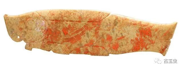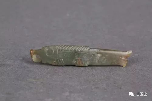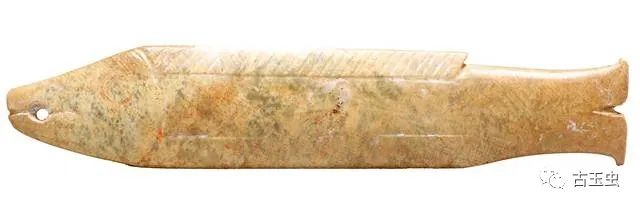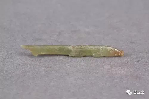 绿色玉,表面有附着物。长条状,单圈大眼,线刻鱼鳍、鱼鳞,其手法并非写实,而是象征性的表现鱼的主要特点。
