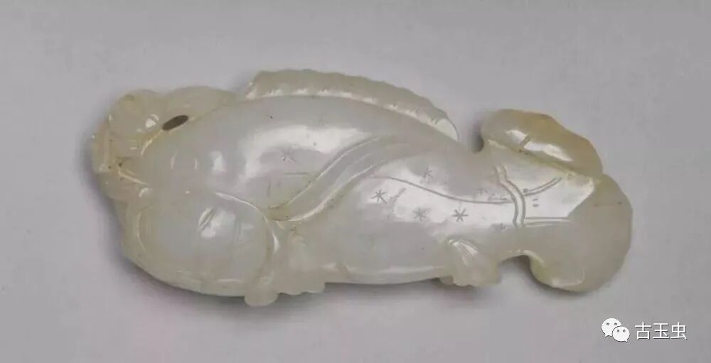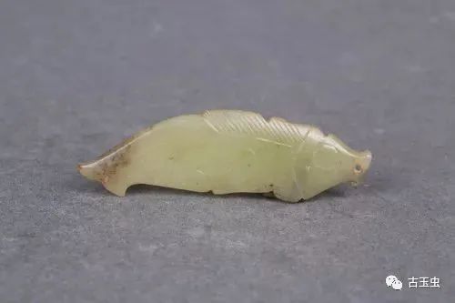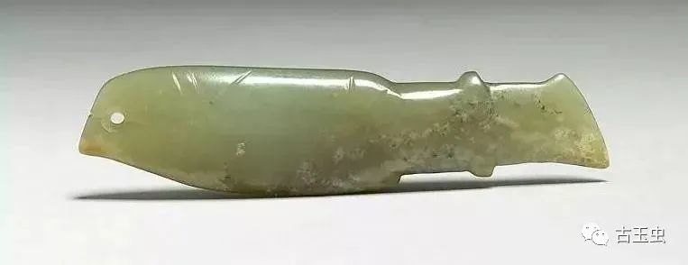 青玉,局部带白斑及墨斑。鱼形,鱼体呈直线,尾巴直长,头部及尾端较薄。眼睛钻一圆孔,可以佩戴。