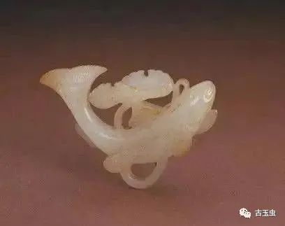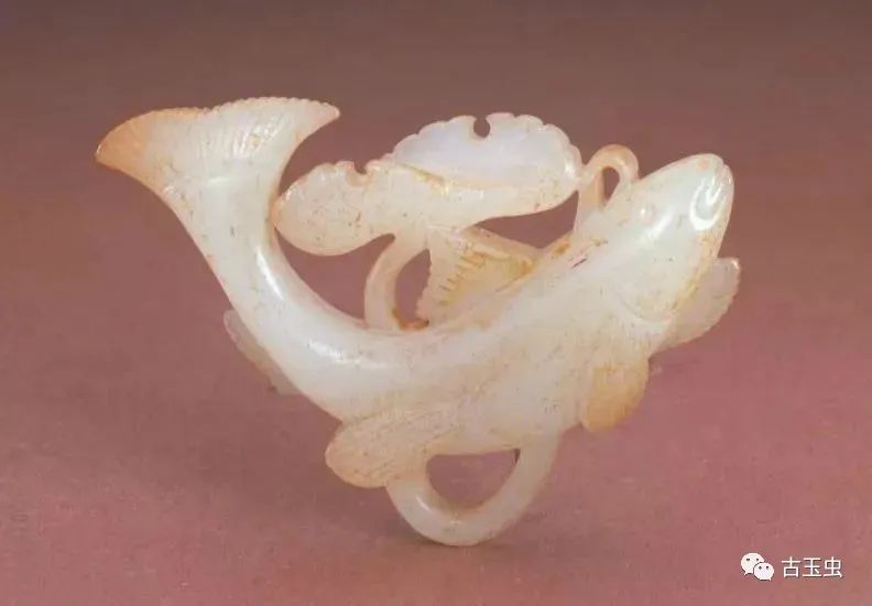 玉色白,表面有赭黄色斑。鱼小头,长身,无鳞,鱼身弯成弧状,昂首,尾上翘,鳍短而厚,共6片,其上有细阴线。鱼身旁伴一荷叶,长梗弯曲,盘而成环,可供穿系绳。