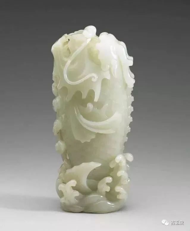 玉质。此花插作一鳌鱼跃出水面,另有如意云纹、火球纹。